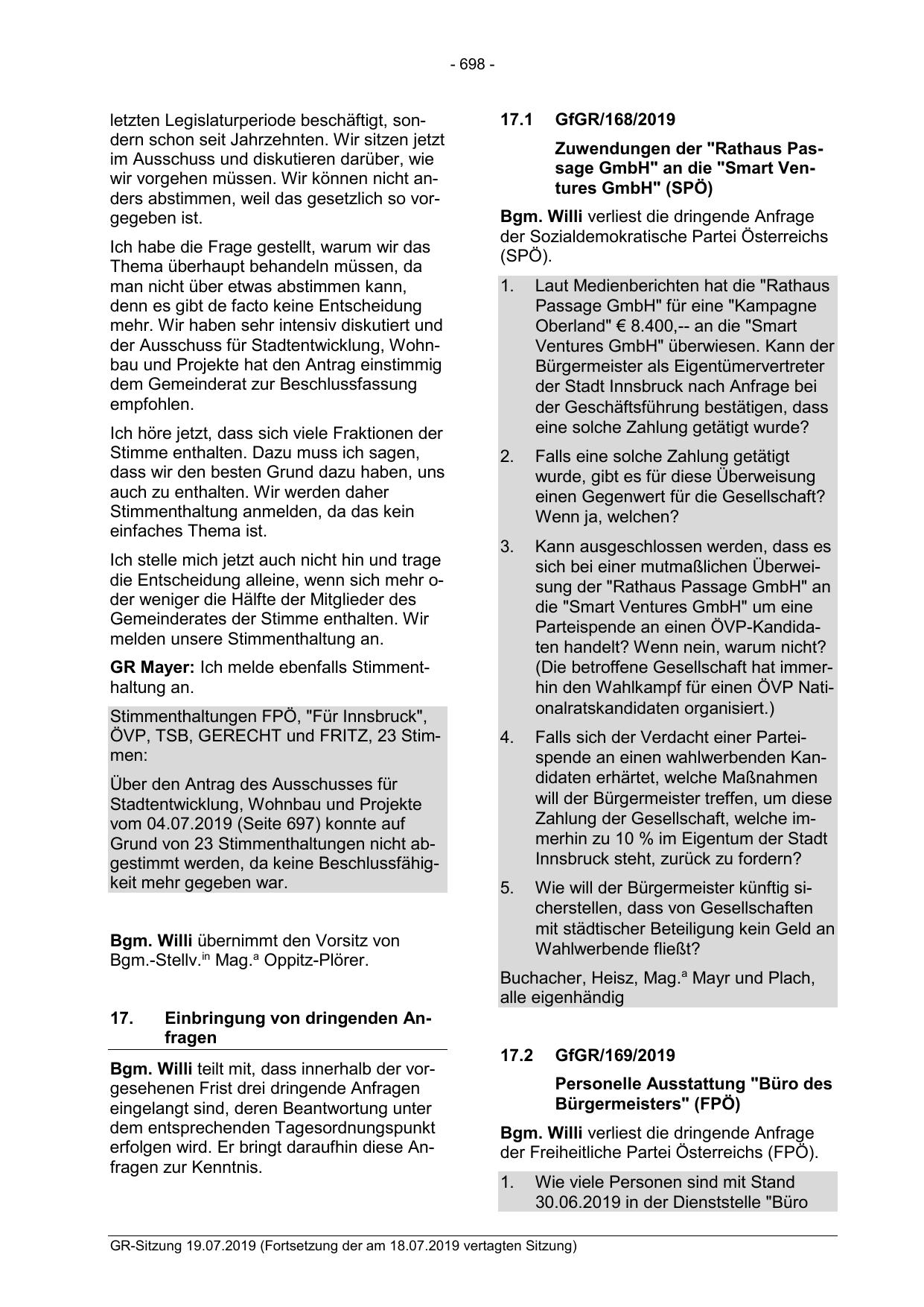 GR-Sitzung 19.07.2019 (Fortsetzung der am 18.07.2019 vertagten Sitzung)