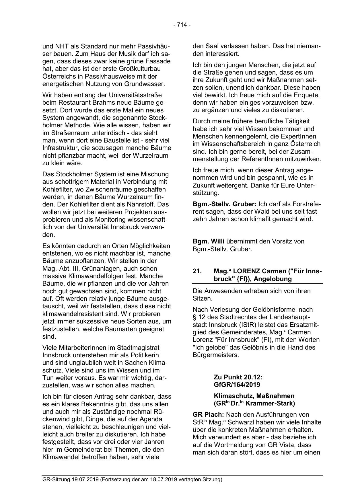 § 12 des Stadtrechtes der Landeshauptstadt Innsbruck (IStR) leistet das Ersatzmitglied des Gemeinderates, Mag.a Carmen