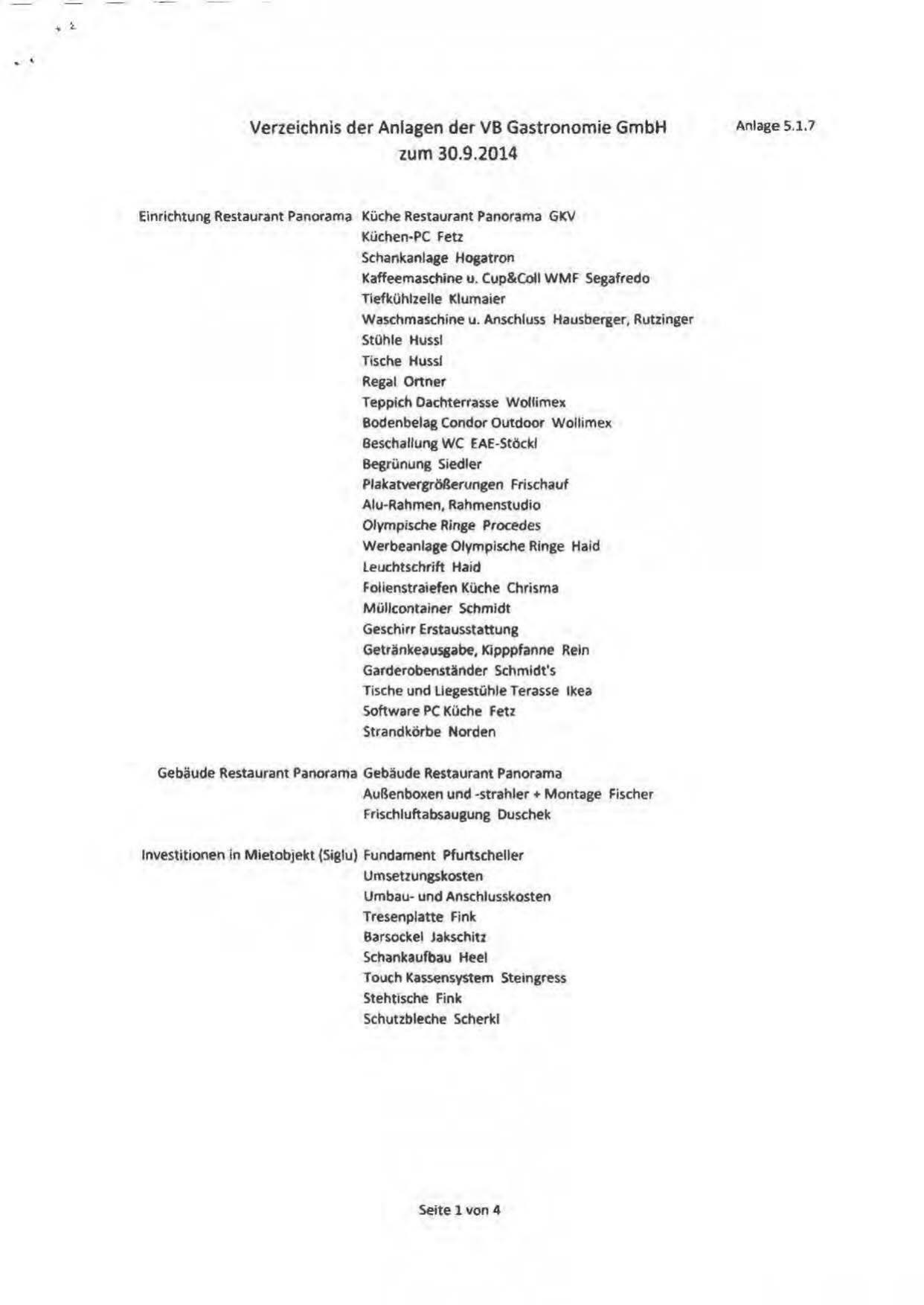 Verzeichnls der Anlagen der VB Gastronomie GmbH