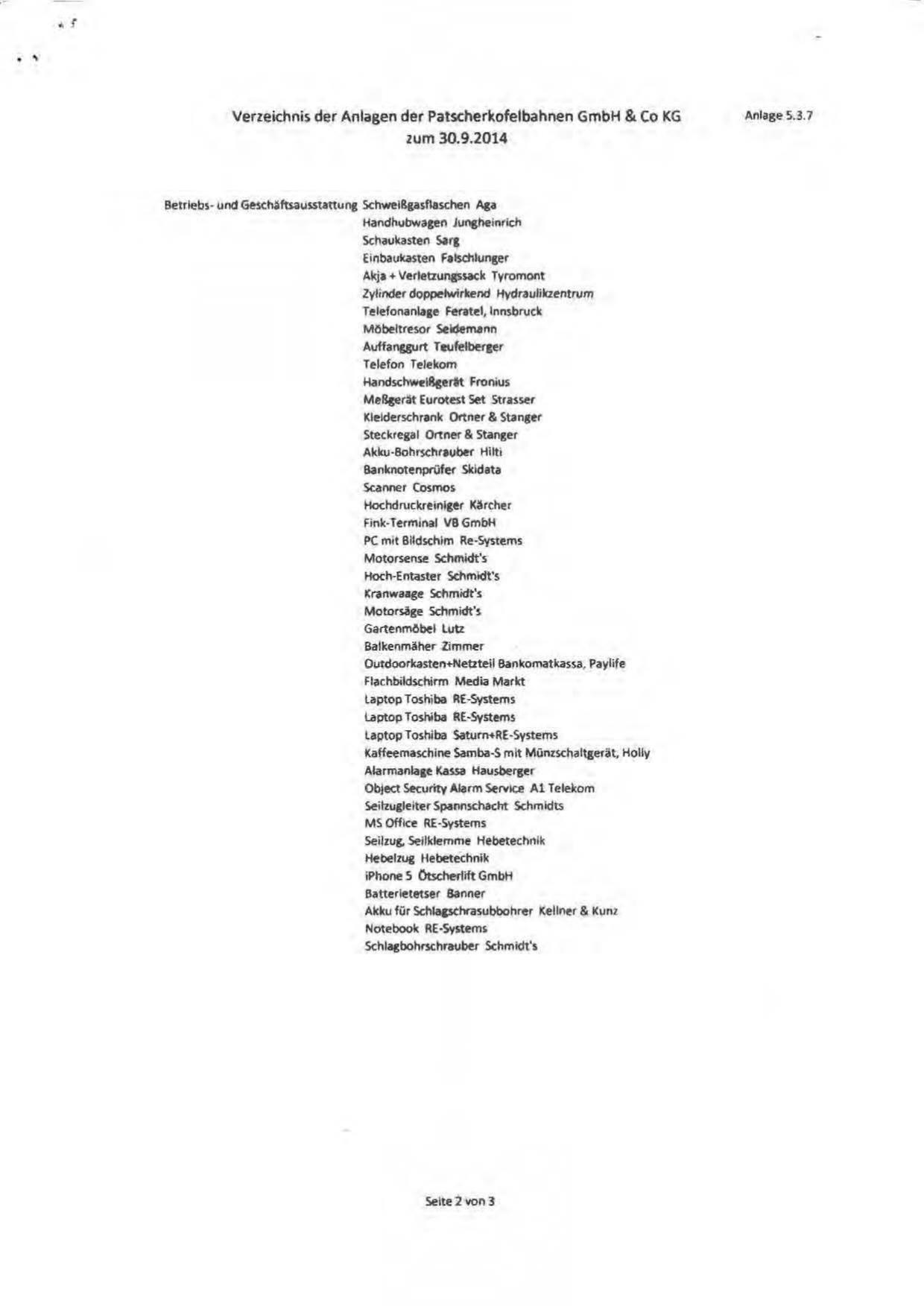 Verieichni$ der Anlagen der Patscherkofeföahnen GmbH & Co KG