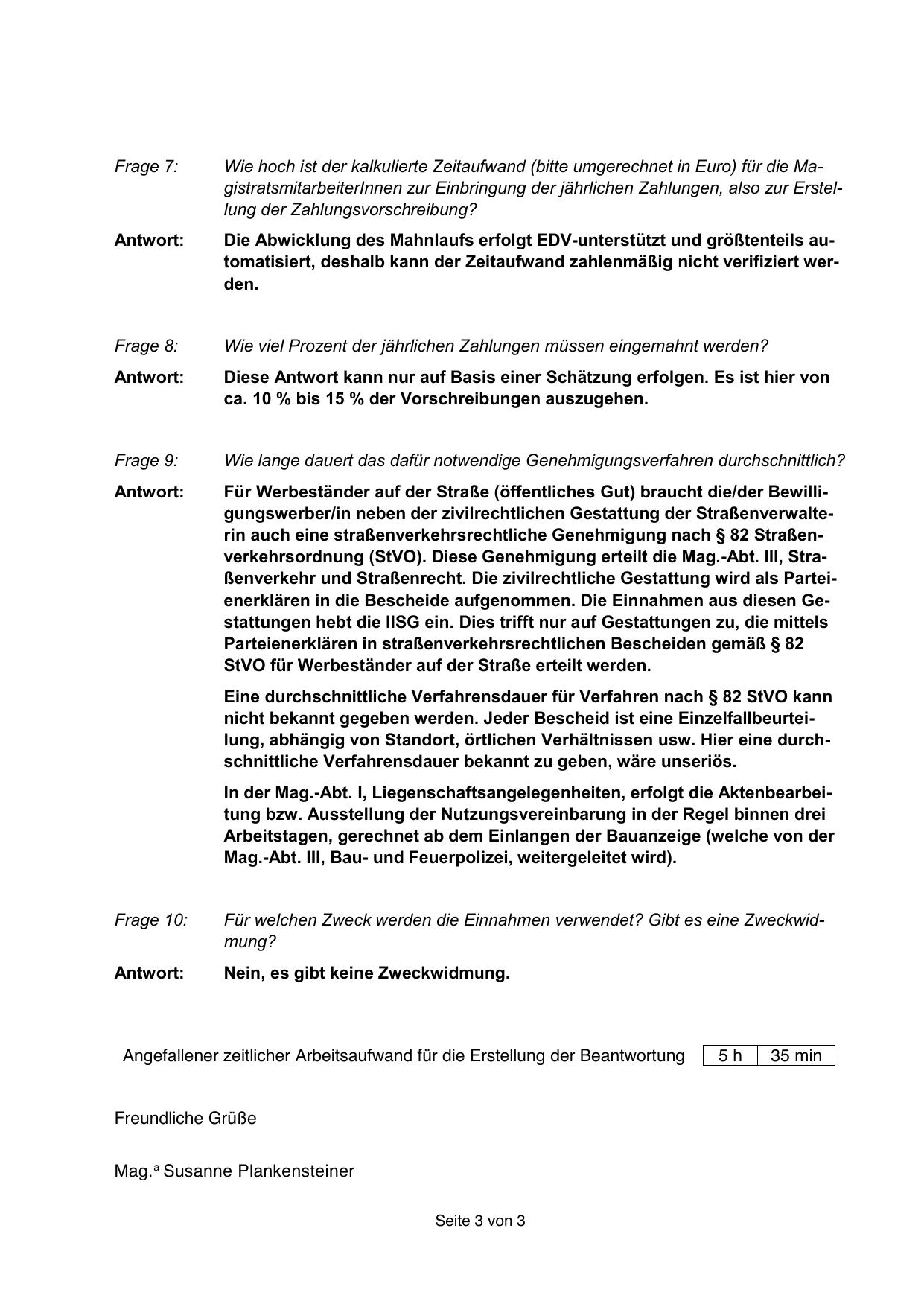 Für Werbeständer auf der Straße (öffentliches Gut) braucht die/der Bewilligungswerber/in neben der zivilrechtlichen Gestattung der Straßenverwalterin auch eine straßenverkehrsrechtliche Genehmigung nach § 82 Straßenverkehrsordnung (StVO). Diese Genehmigung erteilt die Mag.-Abt. III, Straßenverkehr und Straßenrecht. Die zivilrechtliche Gestattung wird als Parteienerklären in die Bescheide aufgenommen. Die Einnahmen aus diesen Gestattungen hebt die IISG ein. Dies trifft nur auf Gestattungen zu, die mittels