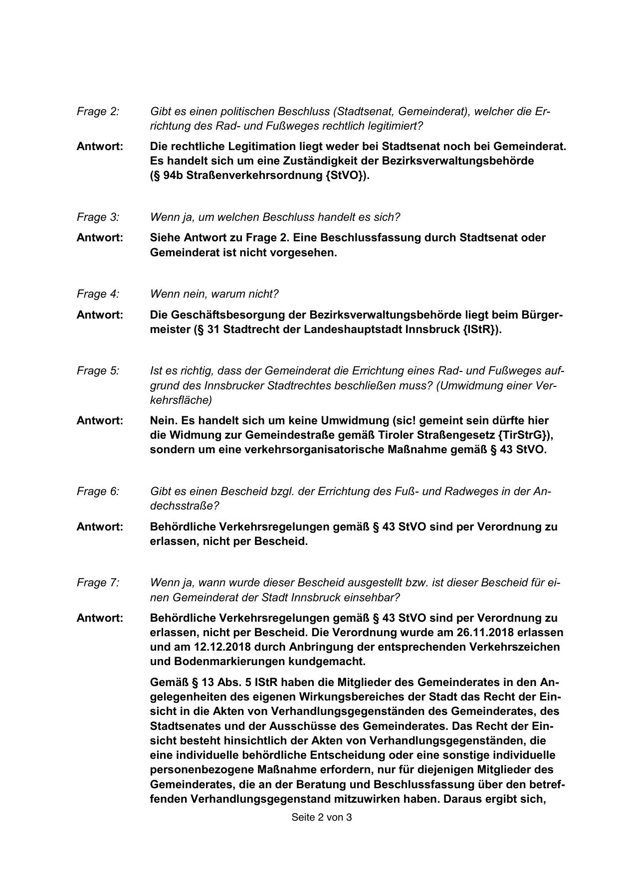 Ist es richtig, dass der Gemeinderat die Errichtung eines Rad- und Fußweges aufgrund des Innsbrucker Stadtrechtes beschließen muss? (Umwidmung einer Verkehrsfläche)