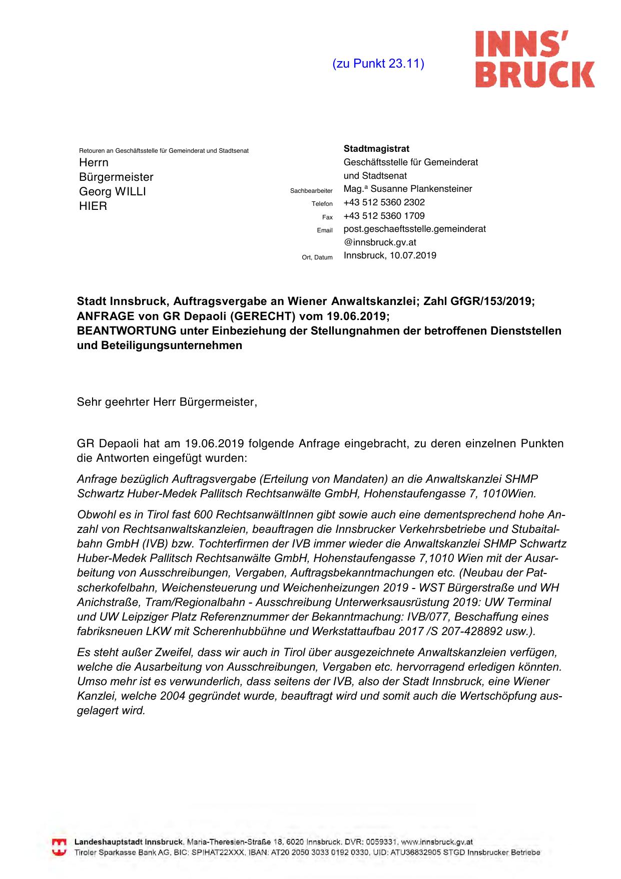 Stadt Innsbruck, Auftragsvergabe an Wiener Anwaltskanzlei; Zahl GfGR/153/2019;
