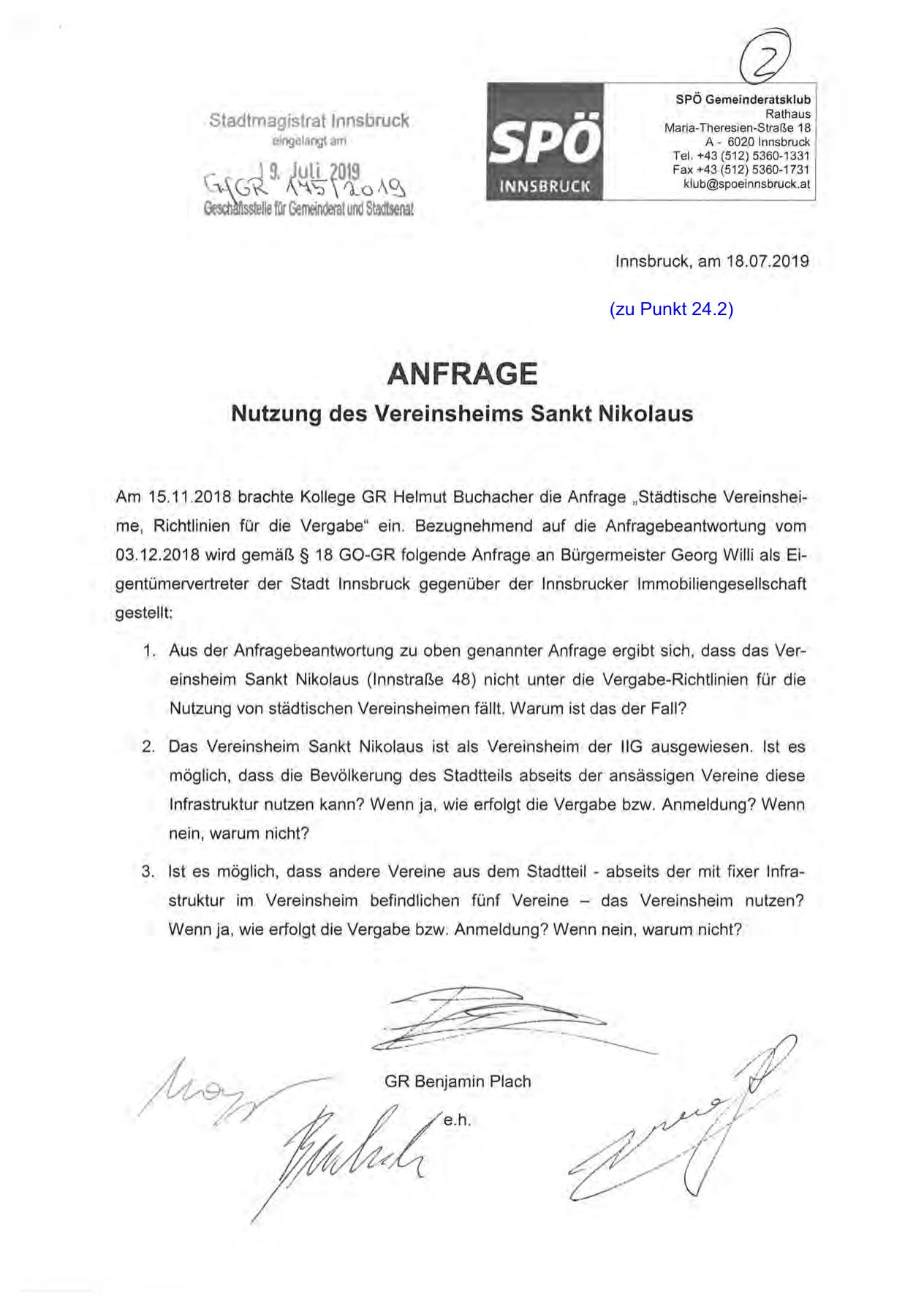 03.12.2018 wird gemäß § 18 GO-GR folgende Anfrage an Bürgermeister Georg Willi als Eigentümervertreter der Stadt Innsbruck gegenüber der lnnsbrucker Immobiliengesellschaft