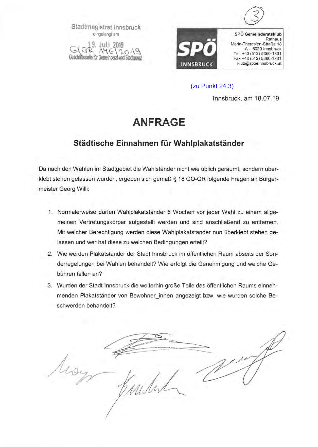 Da nach den Wahlen im Stadtgebiet die Wahlständer nicht wie üblich geräumt. sondern überklebt stehen gelassen wurden, ergeben sich gemäß § 18 GO-GR folgende Fragen an Bürgermeister Georg Willi: