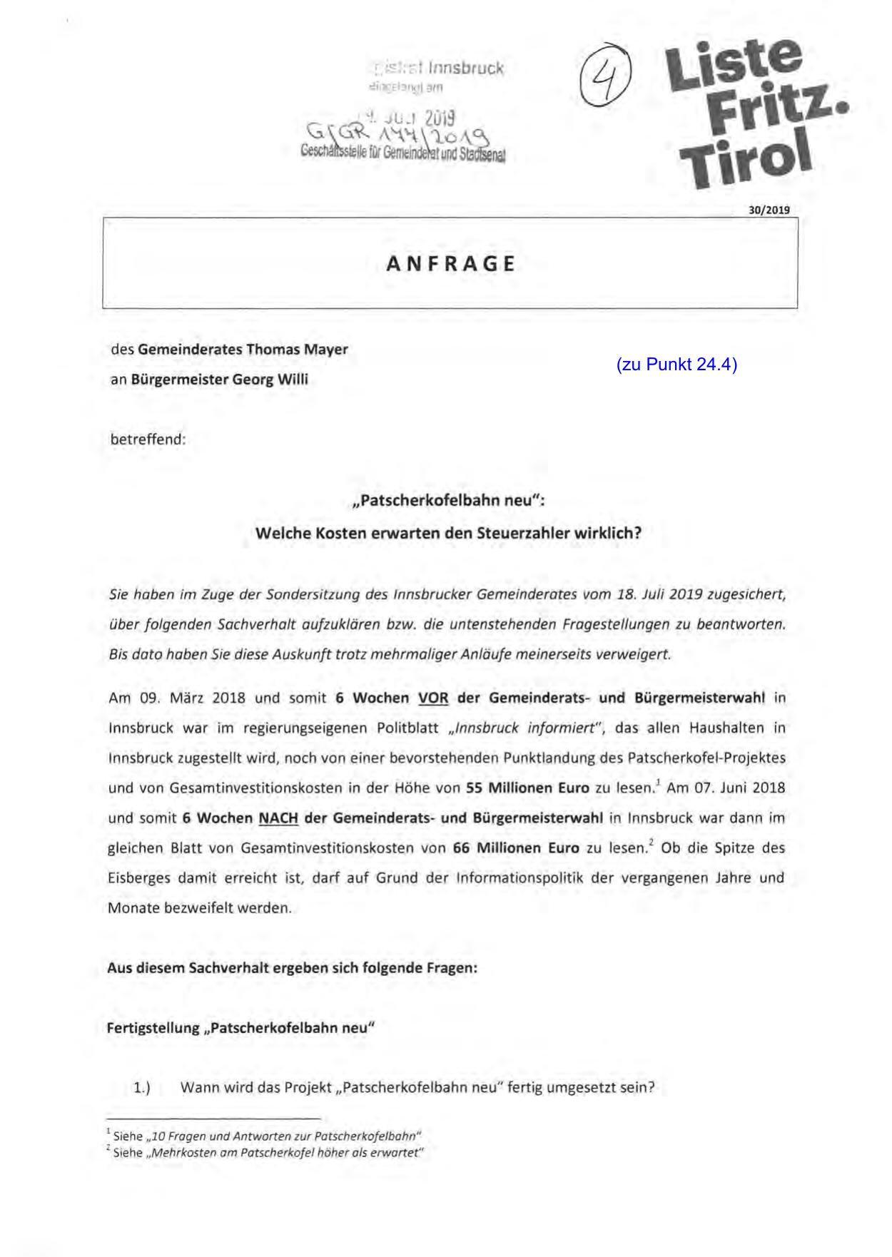 Sie haben im Zuge der Sondersitzung des lnnsbrucker Gemeinderates vom 18. Juli 2019 zugesichert,