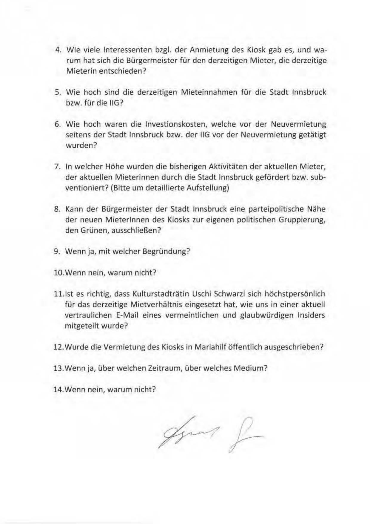 4. Wie viele Interessenten bzgl. der Anmietung des Kiosk gab es, und warum hat sich die Bürgermeister für den derzeitigen Mieter, die derzeitige