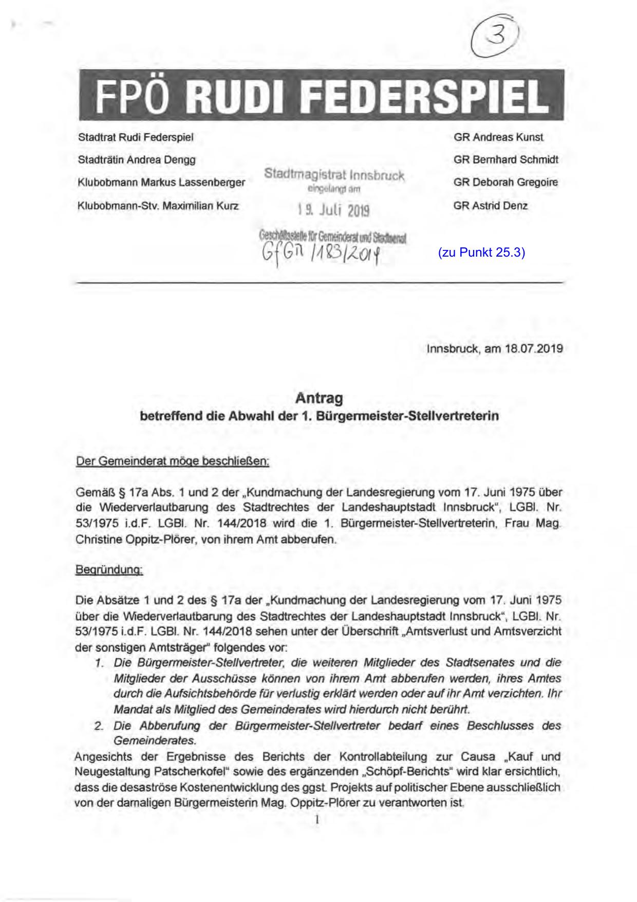 betreffend die Abwahl der 1. Bürgermeister-Stellvertreterin