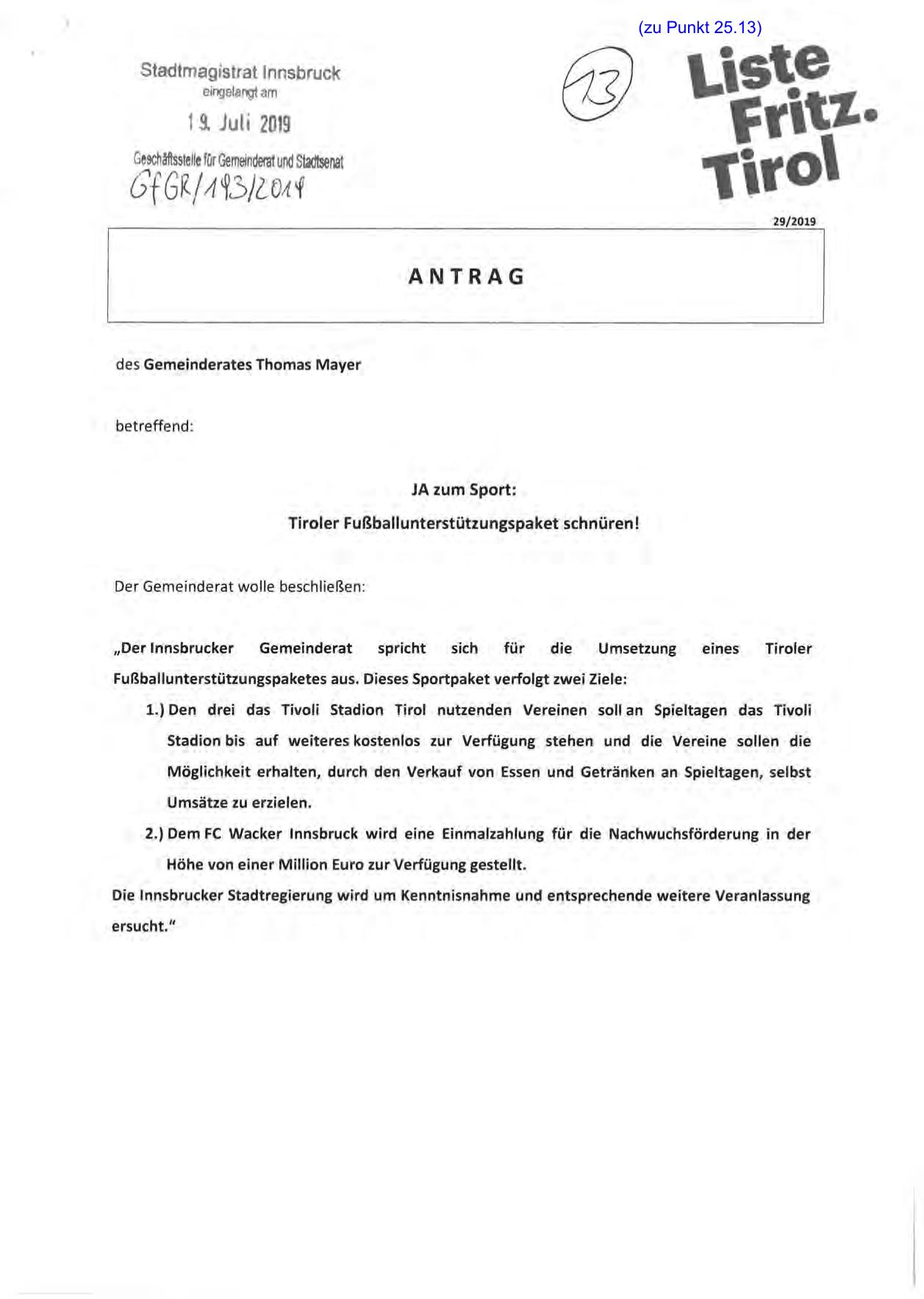1.) Den drei das Tivoli Stadion Tirol nutzenden Vereinen soll an Spieltagen das Tivoli