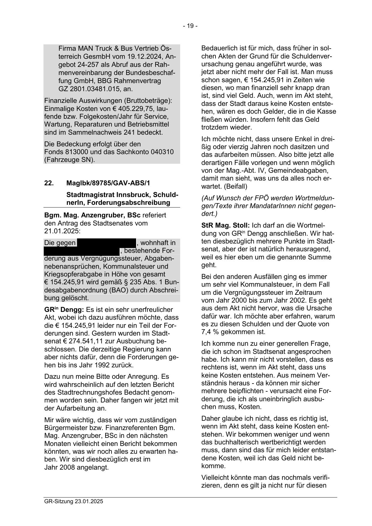 die € 154.245,91 leider nur ein Teil der Forderungen sind. Gestern wurden im Stadtsenat € 274.541,11 zur Ausbuchung beschlossen. Die derzeitige Regierung kann