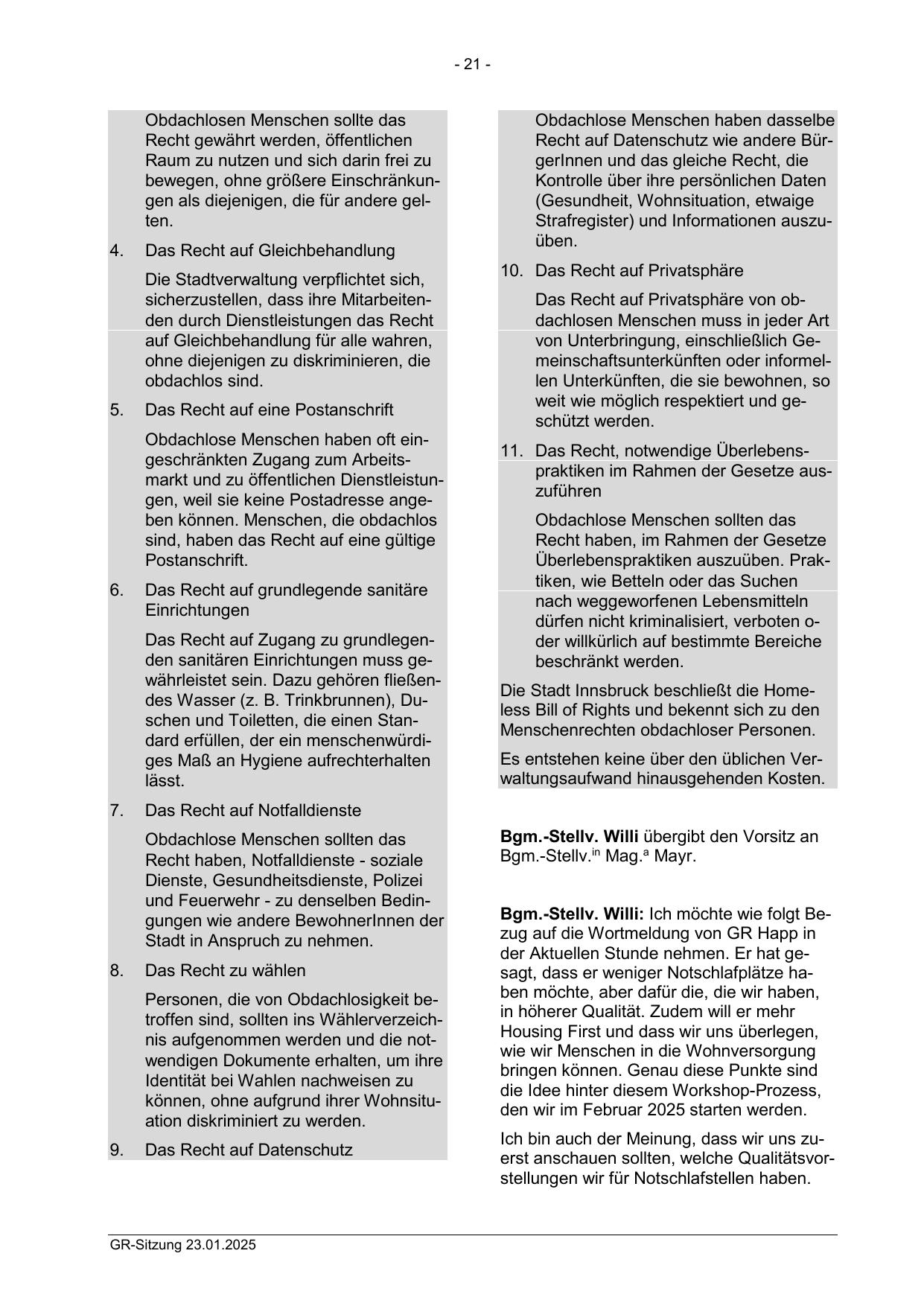 Die Stadt Innsbruck beschließt die Homeless Bill of Rights und bekennt sich zu den
