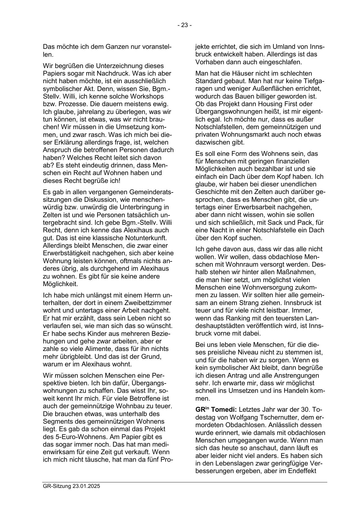 GRin Tomedi: Letztes Jahr war der 30. Todestag von Wolfgang Tschernutter, dem ermordeten Obdachlosen. Anlässlich dessen