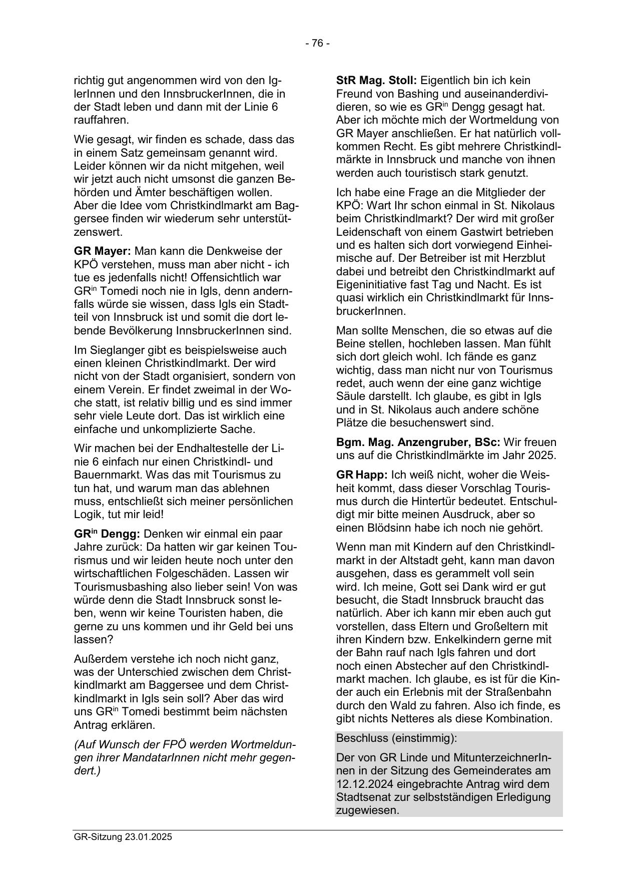 GR Mayer anschließen. Er hat natürlich vollkommen Recht. Es gibt mehrere Christkindlmärkte in Innsbruck und manche von ihnen