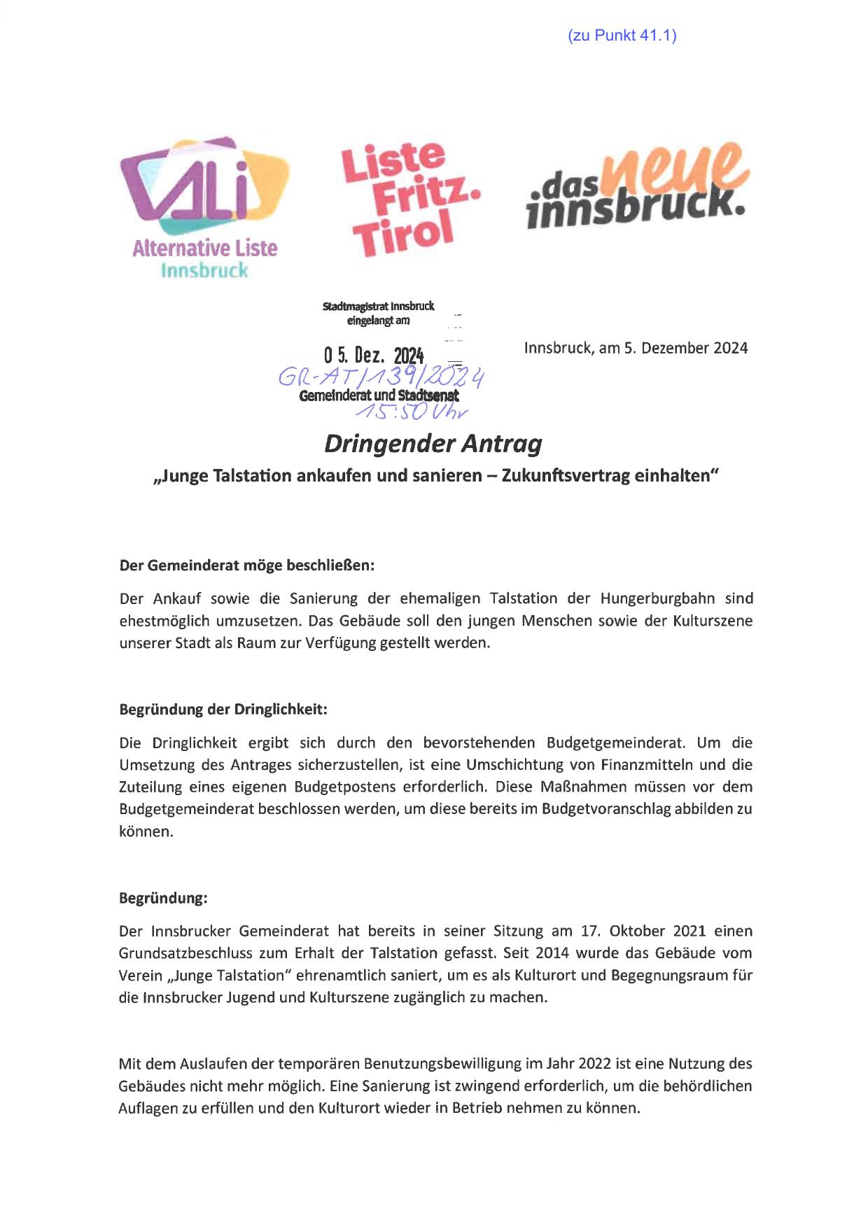 „Junge Talstation ankaufen und sanieren —- Zukunftsvertrag einhalten“