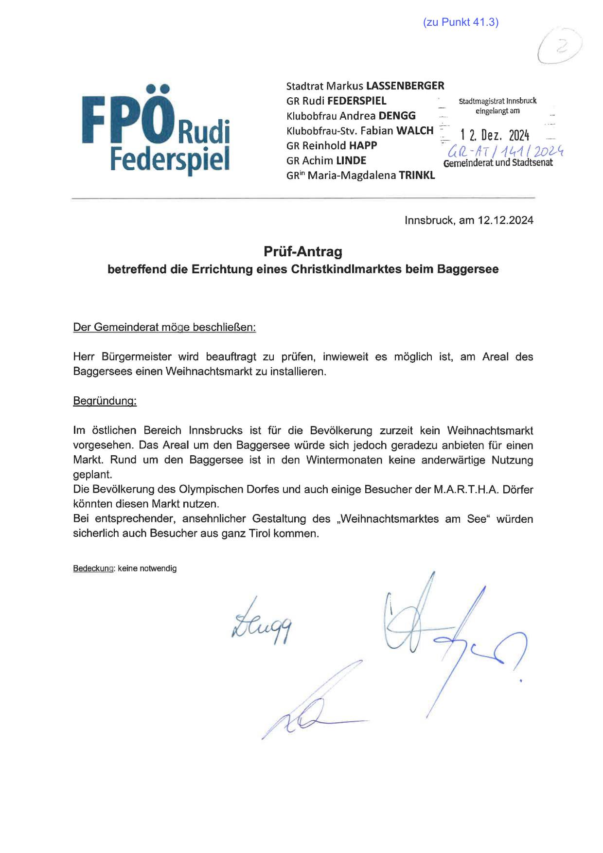 betreffend die Errichtung eines Christkindlmarktes beim Baggersee