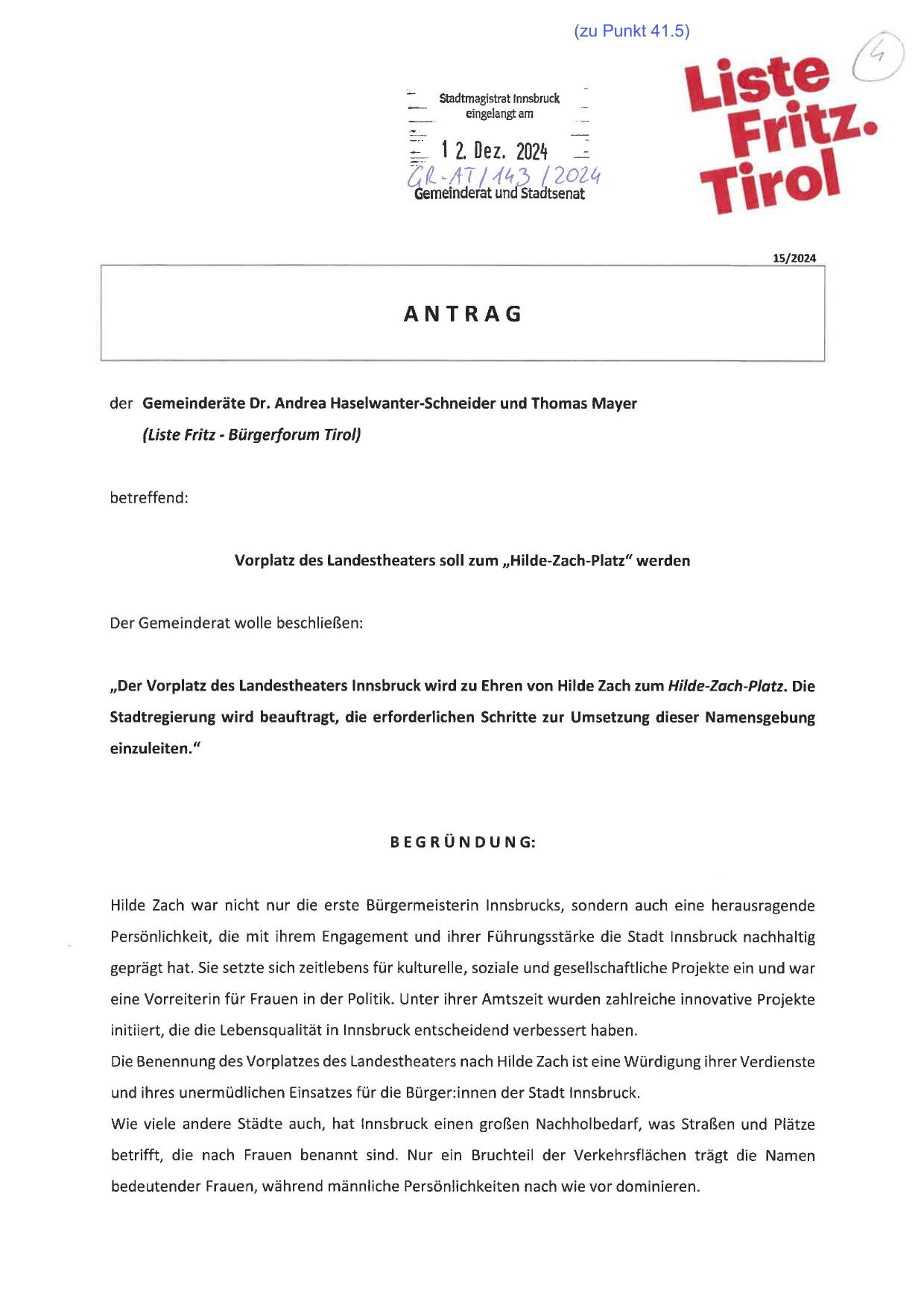 „Der Vorplatz des Landestheaters Innsbruck wird zu Ehren von Hilde Zach zum Hilde-Zach-Platz. Die