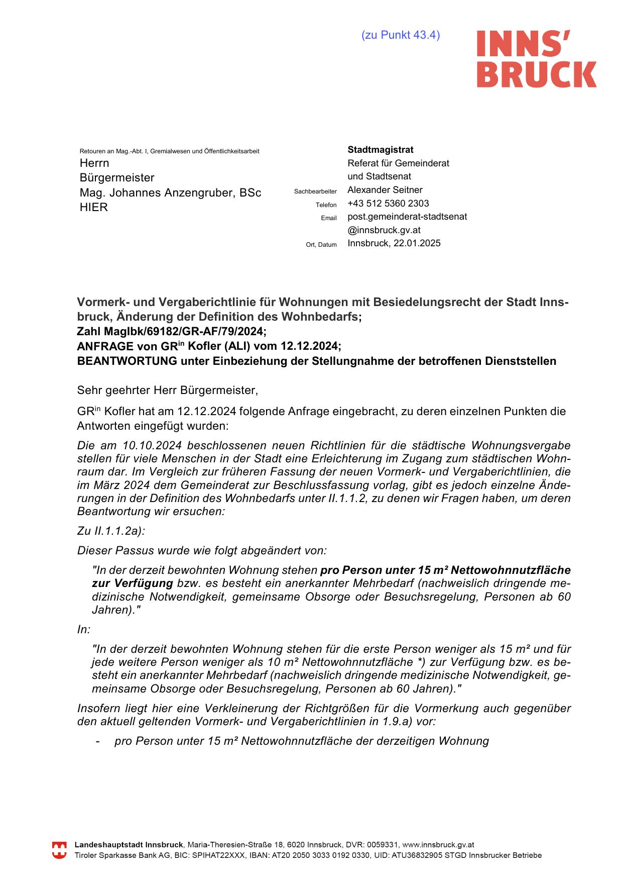 GRin Kofler hat am 12.12.2024 folgende Anfrage eingebracht, zu deren einzelnen Punkten die