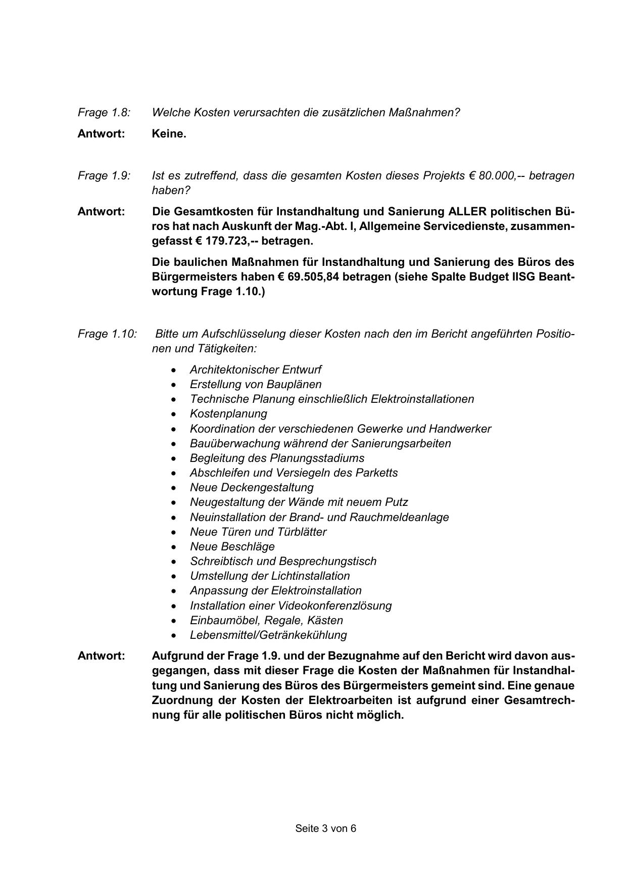 Die Gesamtkosten für Instandhaltung und Sanierung ALLER politischen Büros hat nach Auskunft der Mag.-Abt. I, Allgemeine Servicedienste, zusammengefasst € 179.723,-- betragen.
