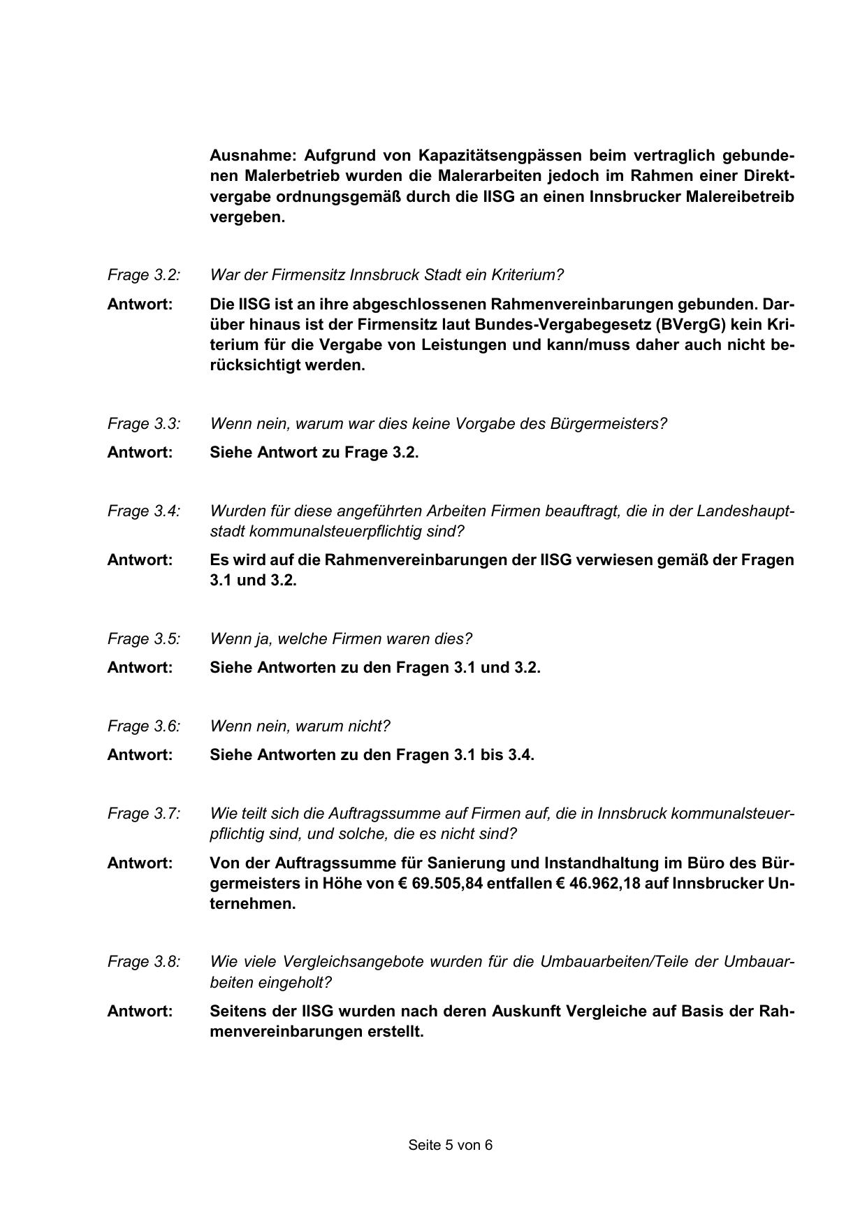 Ausnahme: Aufgrund von Kapazitätsengpässen beim vertraglich gebundenen Malerbetrieb wurden die Malerarbeiten jedoch im Rahmen einer Direktvergabe ordnungsgemäß durch die IISG an einen Innsbrucker Malereibetreib