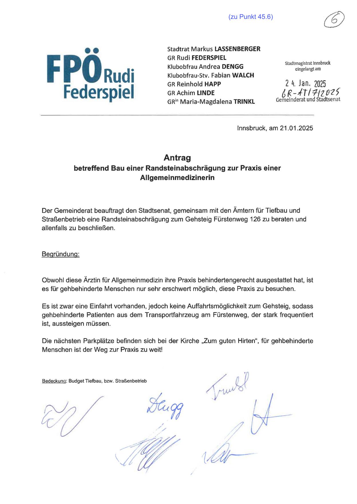 Straßenbetrieb eine Randsteinabschrägung zum Gehsteig Fürstenweg 126 zu beraten und