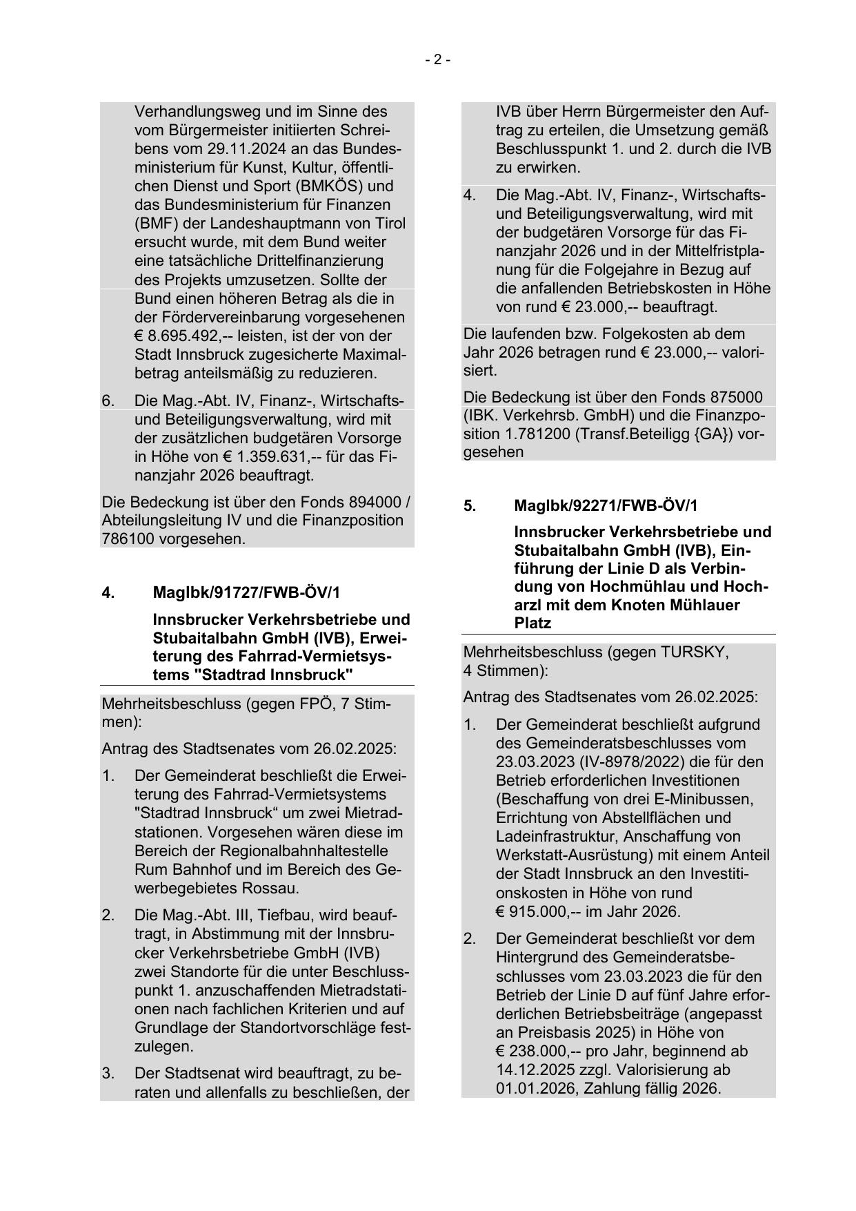 Mehrheitsbeschluss (gegen FPÖ, 7 Stimmen):