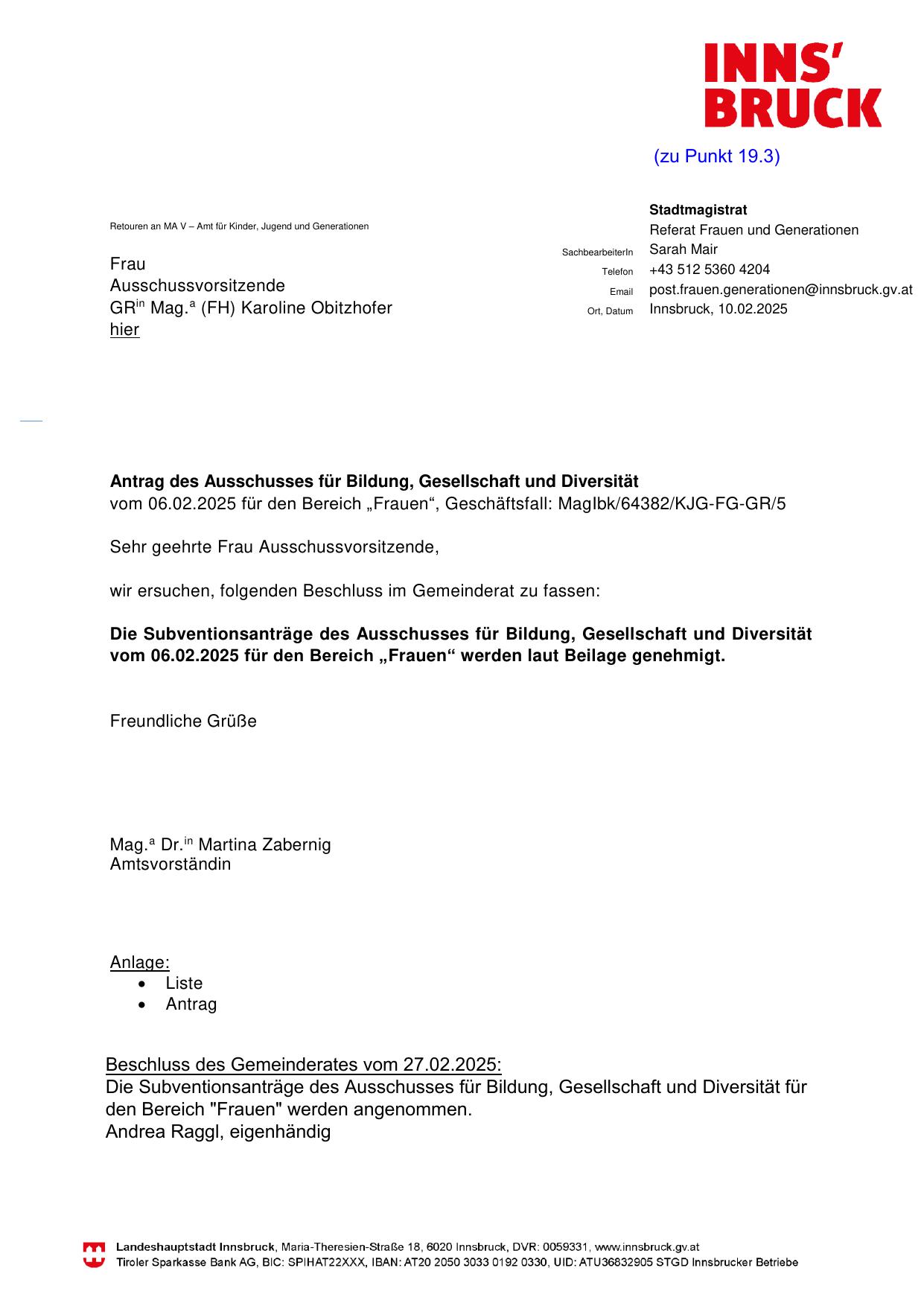 vom 06.02.2025 für den Bereich „Frauen“, Geschäftsfall: MagIbk/64382/KJG-FG-GR/5