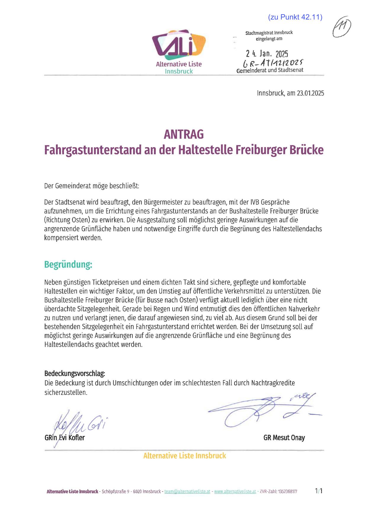 aufzunehmen, um die Errichtung eines Fahrgastunterstands an der Bushaltestelle Freiburger Brücke
