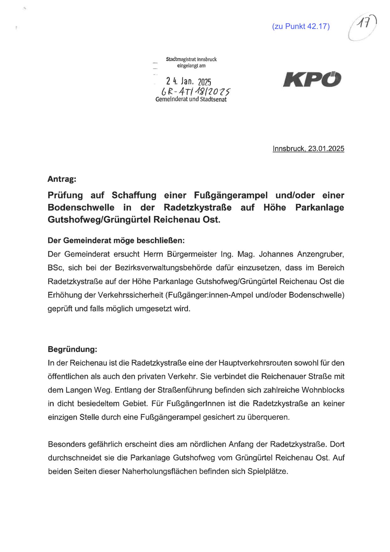 Erhöhung der Verkehrssicherheit (Fußgänger:innen-Ampel und/oder Bodenschwelle)