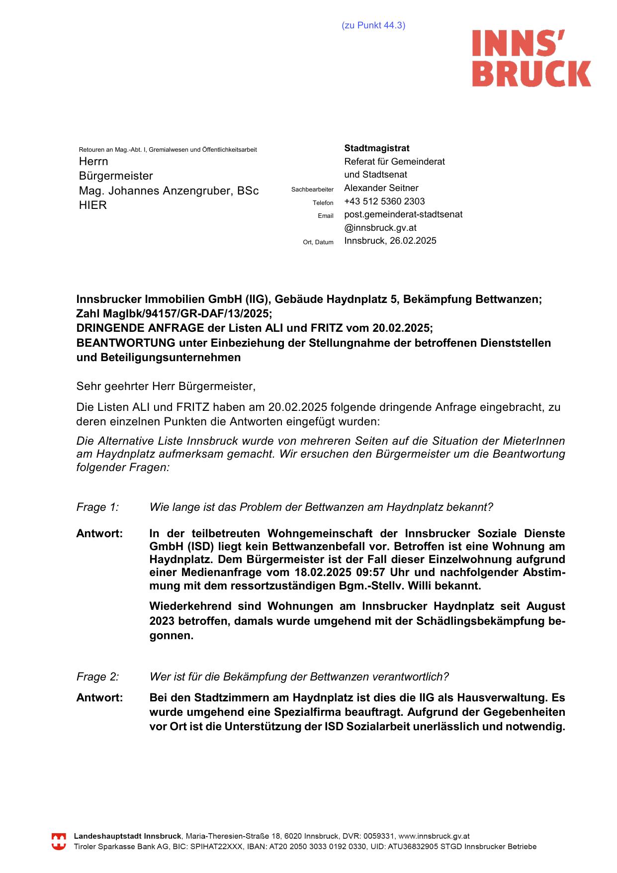 Innsbrucker Immobilien GmbH (IIG), Gebäude Haydnplatz 5, Bekämpfung Bettwanzen;