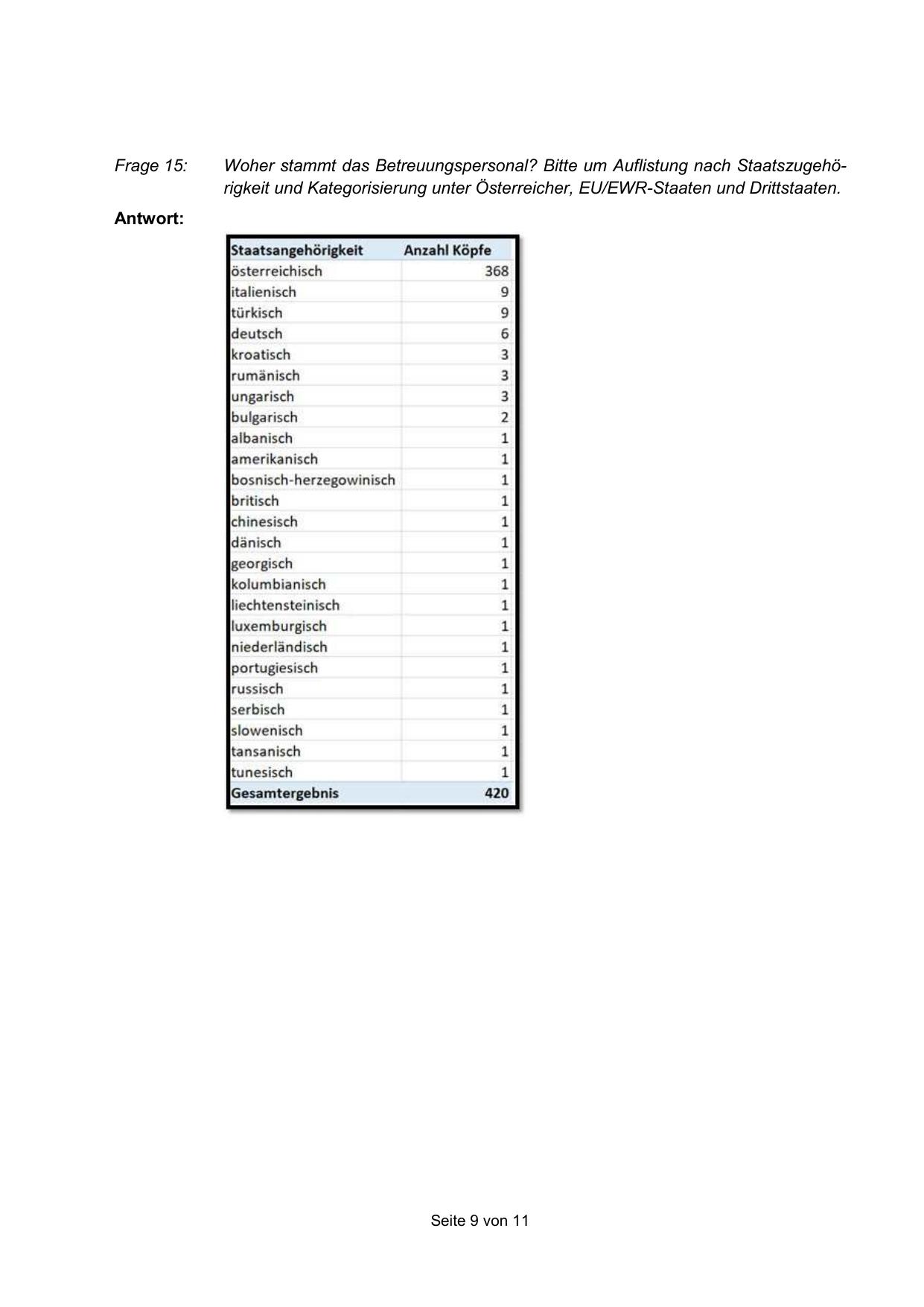 Woher stammt das Betreuungspersonal? Bitte um Auflistung nach Staatszugehörigkeit und Kategorisierung unter Österreicher, EU/EWR-Staaten und Drittstaaten.