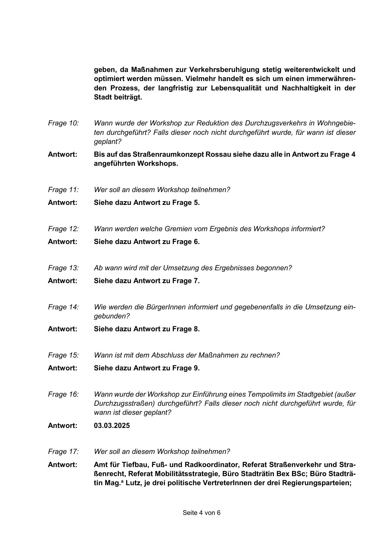 Wann wurde der Workshop zur Reduktion des Durchzugsverkehrs in Wohngebieten durchgeführt? Falls dieser noch nicht durchgeführt wurde, für wann ist dieser