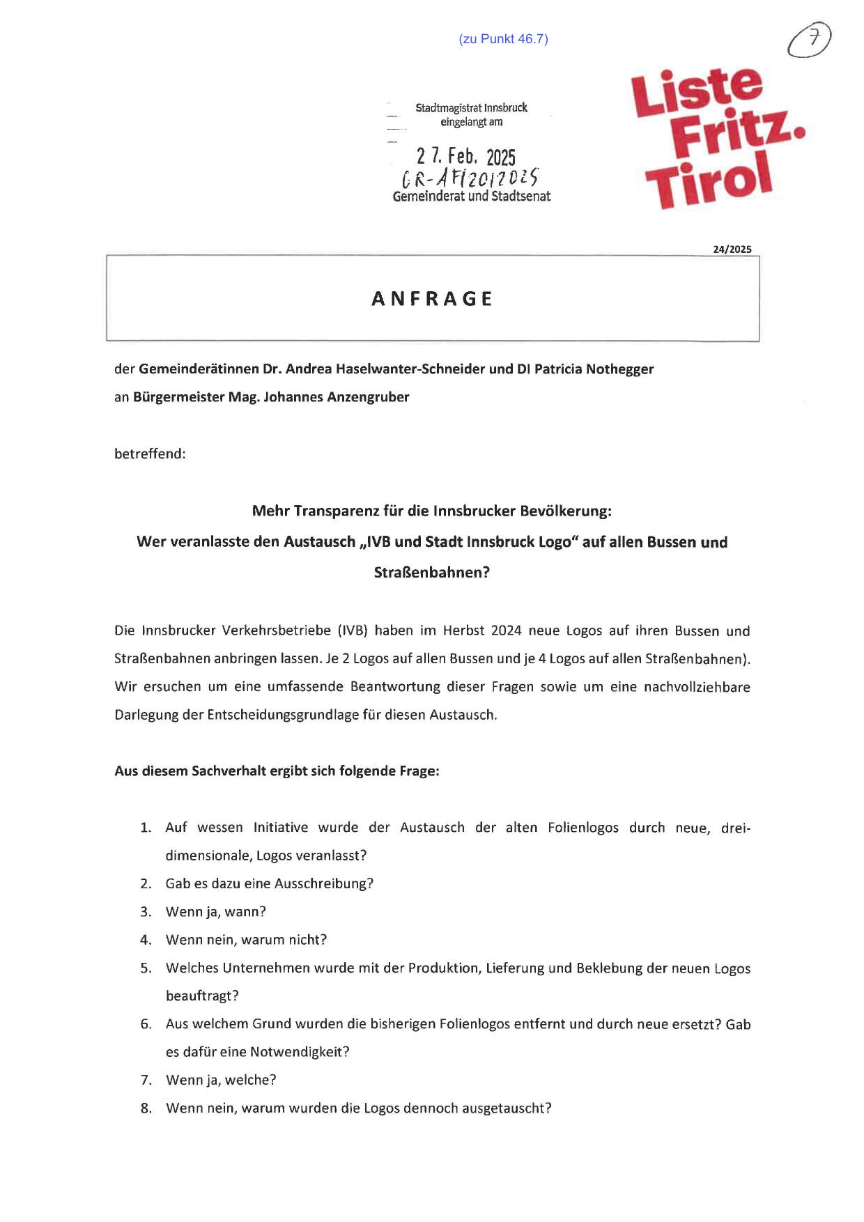 Wer veranlasste den Austausch „IVB und Stadt Innsbruck Logo“ auf allen Bussen und