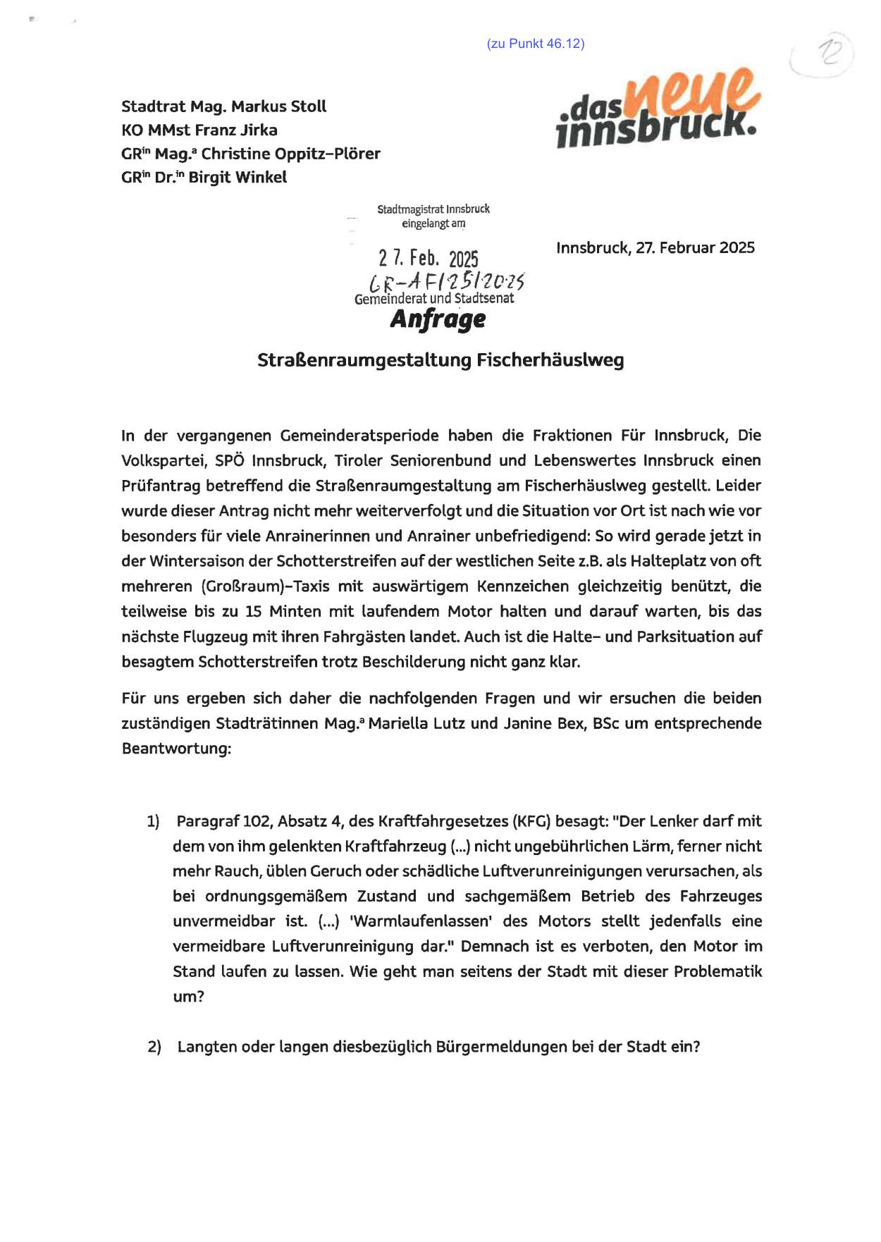 Prüfantrag betreffend die Straßenraumgestaltung am Fischerhäuslweg gestellt. Leider