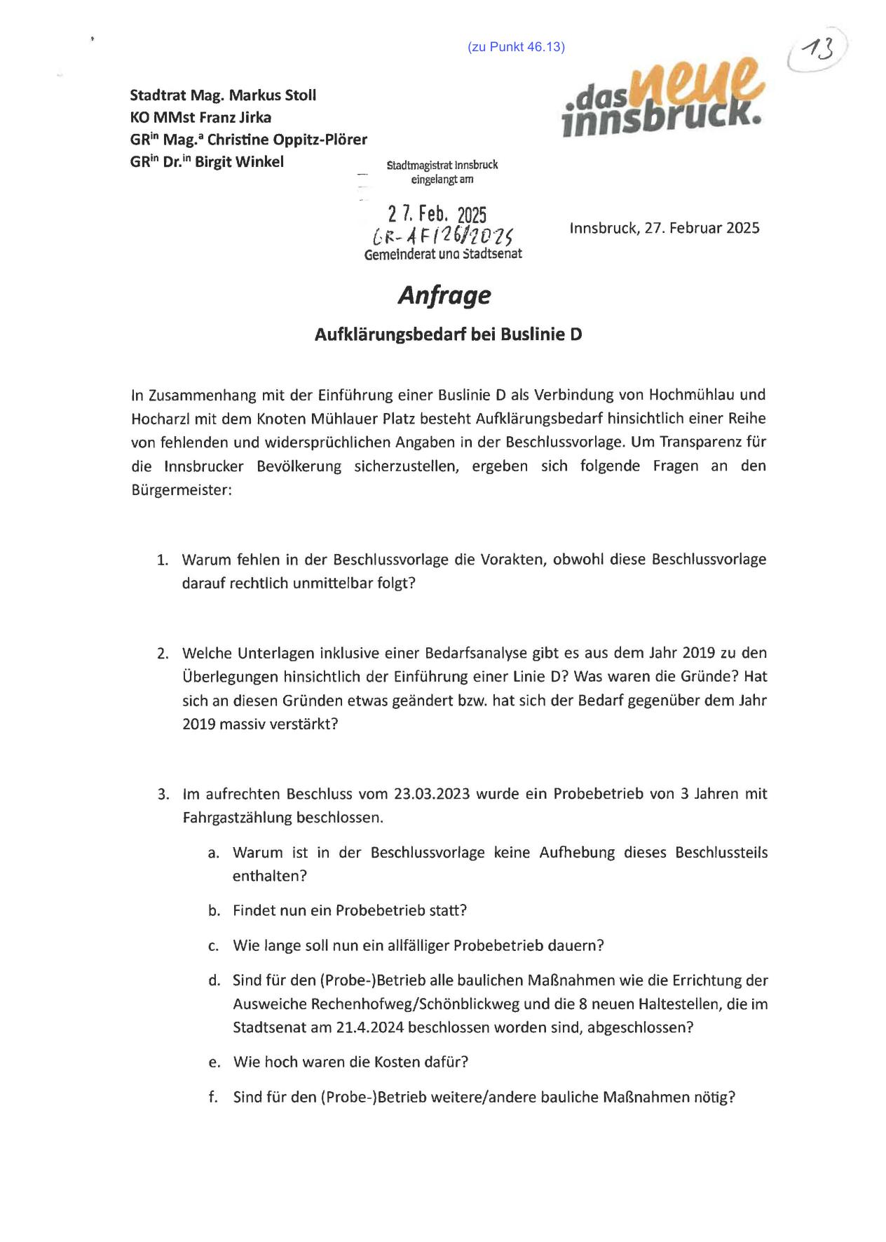 Hocharzl mit dem Knoten Mühlauer Platz besteht Aufklärungsbedarf hinsichtlich einer Reihe