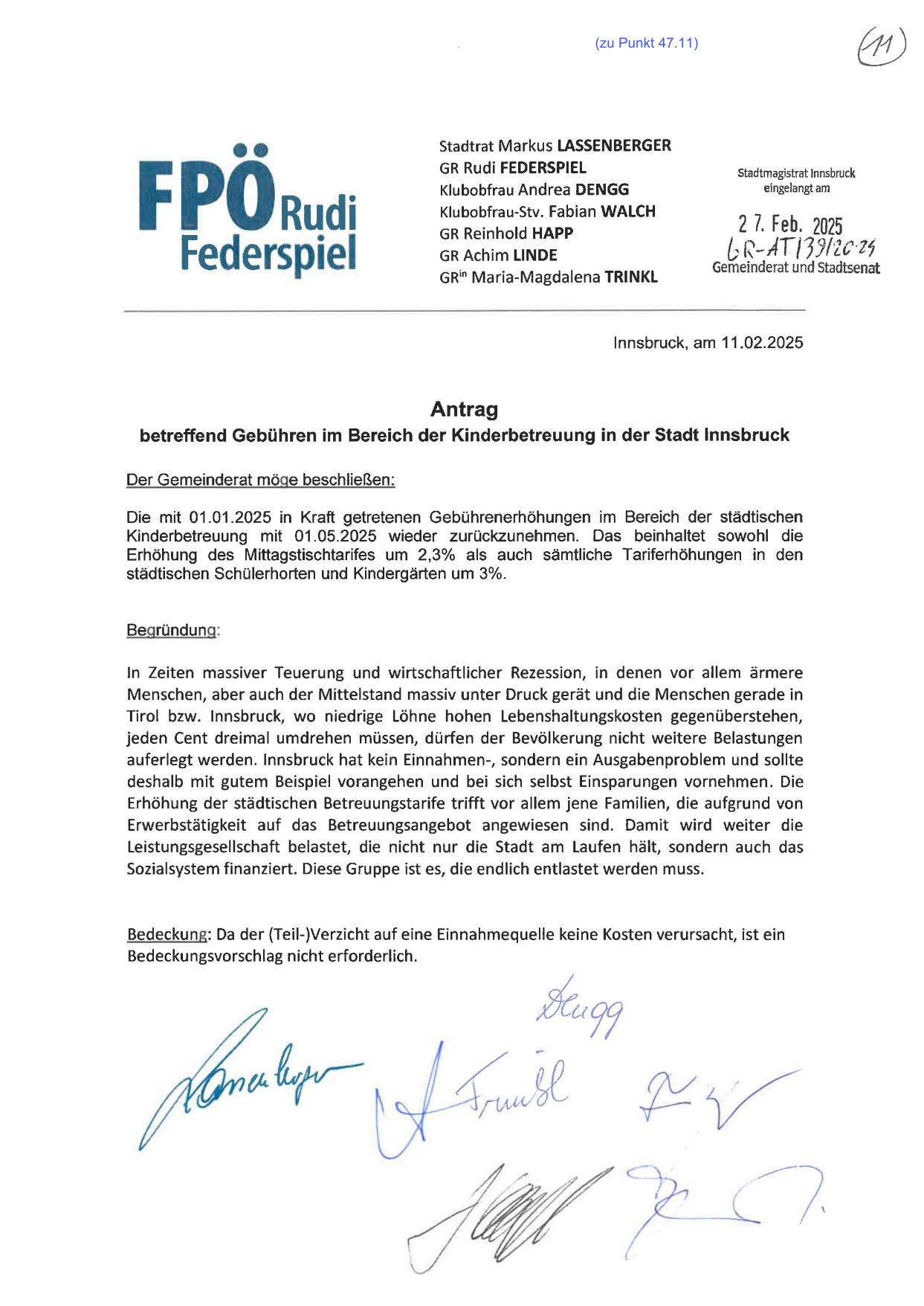 betreffend Gebühren im Bereich der Kinderbetreuung in der Stadt Innsbruck