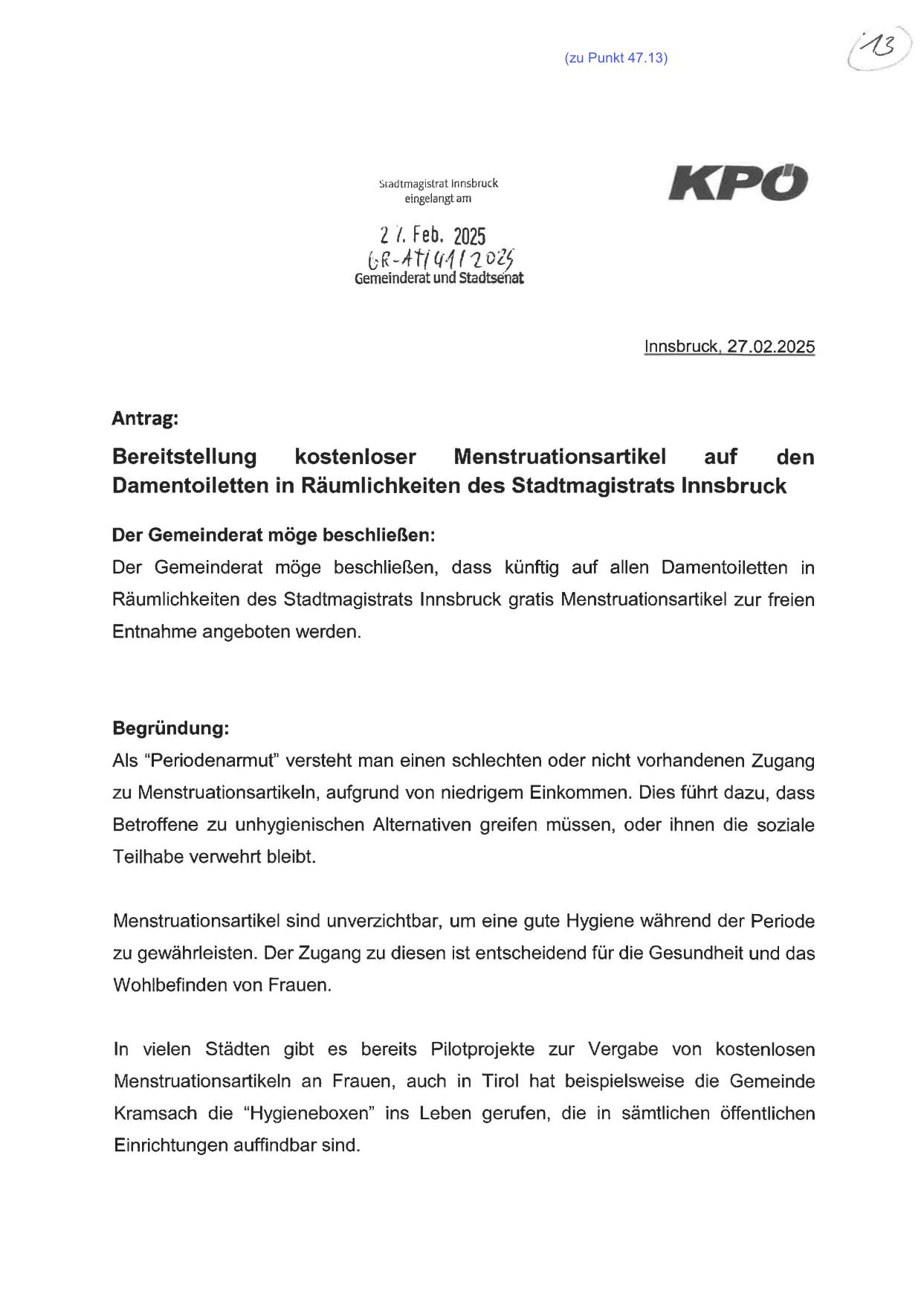 Räumlichkeiten des Stadtmagistrats Innsbruck gratis Menstruationsartikel zur freien