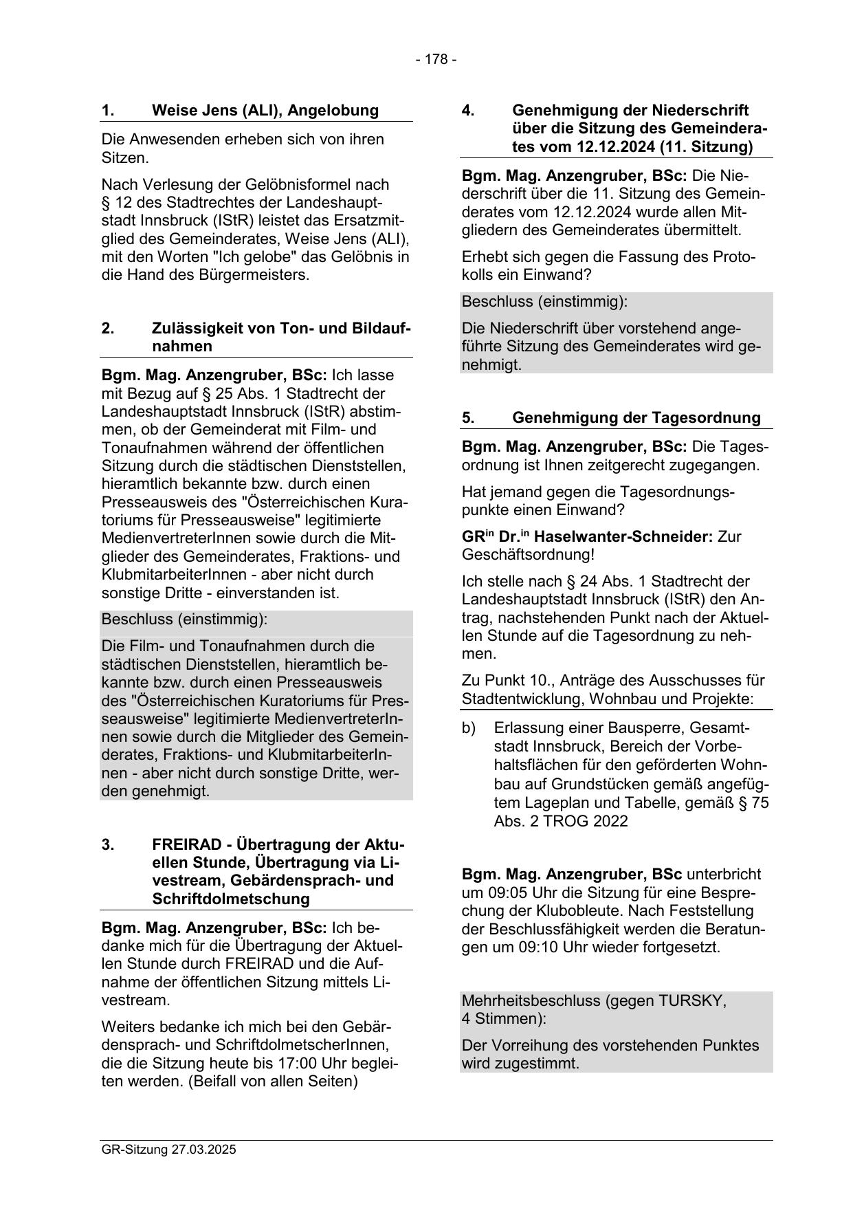 § 12 des Stadtrechtes der Landeshauptstadt Innsbruck (IStR) leistet das Ersatzmitglied des Gemeinderates, Weise Jens (ALI),