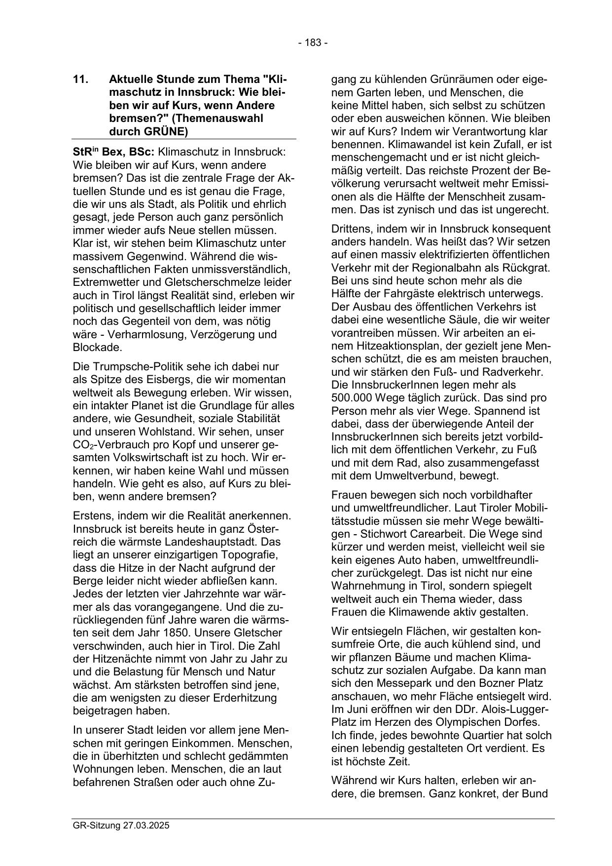 Aktuelle Stunde zum Thema "Klimaschutz in Innsbruck: Wie bleiben wir auf Kurs, wenn Andere