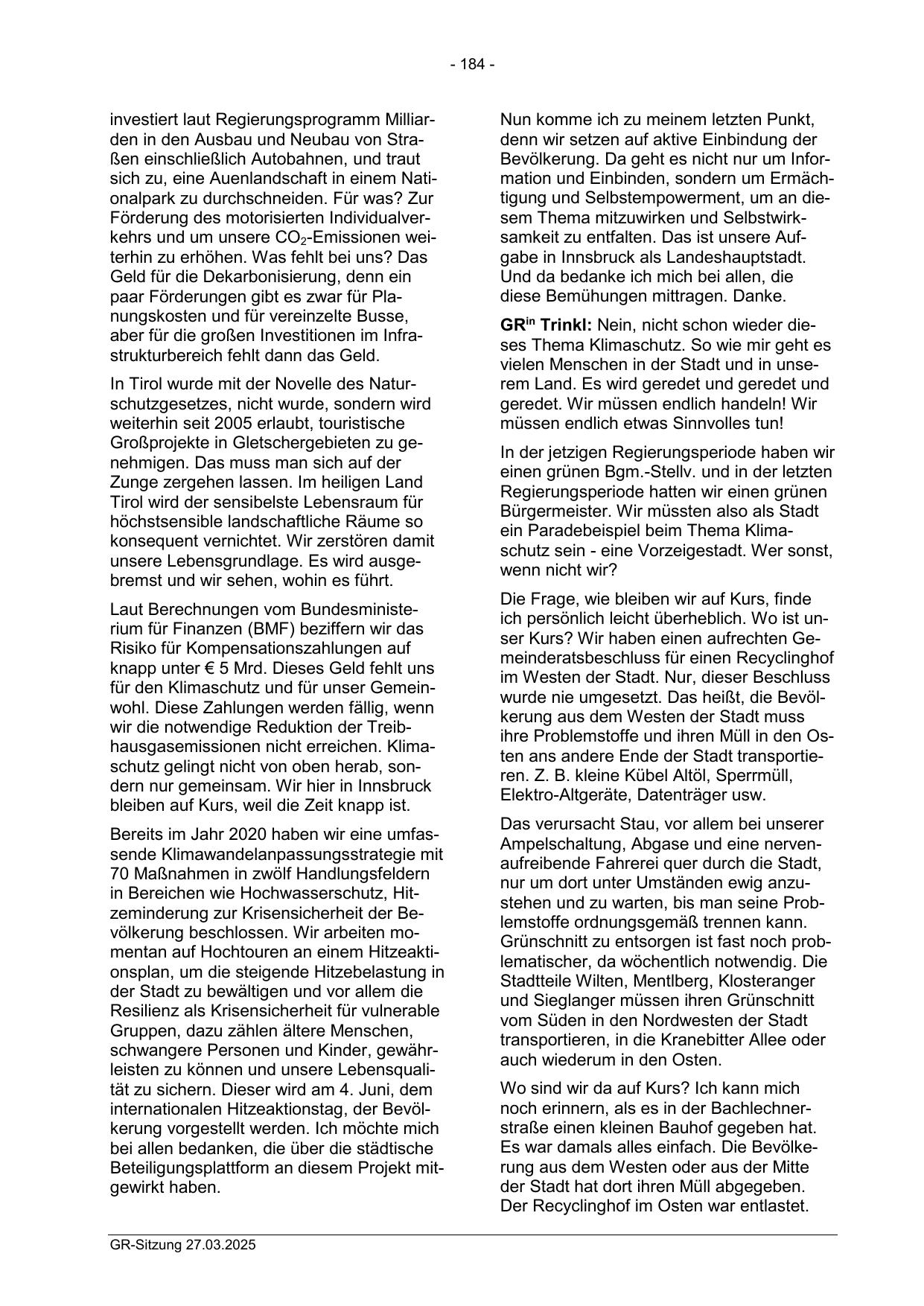 Bevölkerung. Da geht es nicht nur um Information und Einbinden, sondern um Ermächtigung und Selbstempowerment, um an diesem Thema mitzuwirken und Selbstwirksamkeit zu entfalten. Das ist unsere Aufgabe in Innsbruck als Landeshauptstadt.