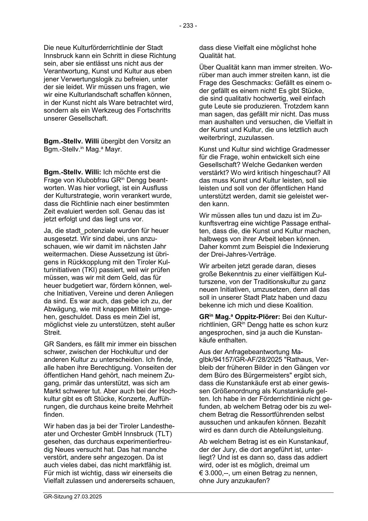 GRin Mag.a Oppitz-Plörer: Bei den Kulturrichtlinien, GRin Dengg hatte es schon kurz
