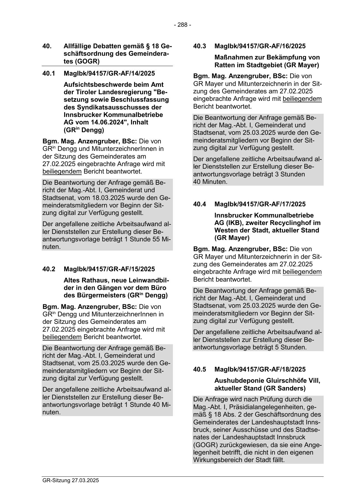 Die Beantwortung der Anfrage gemäß Bericht der Mag.-Abt. I, Gemeinderat und