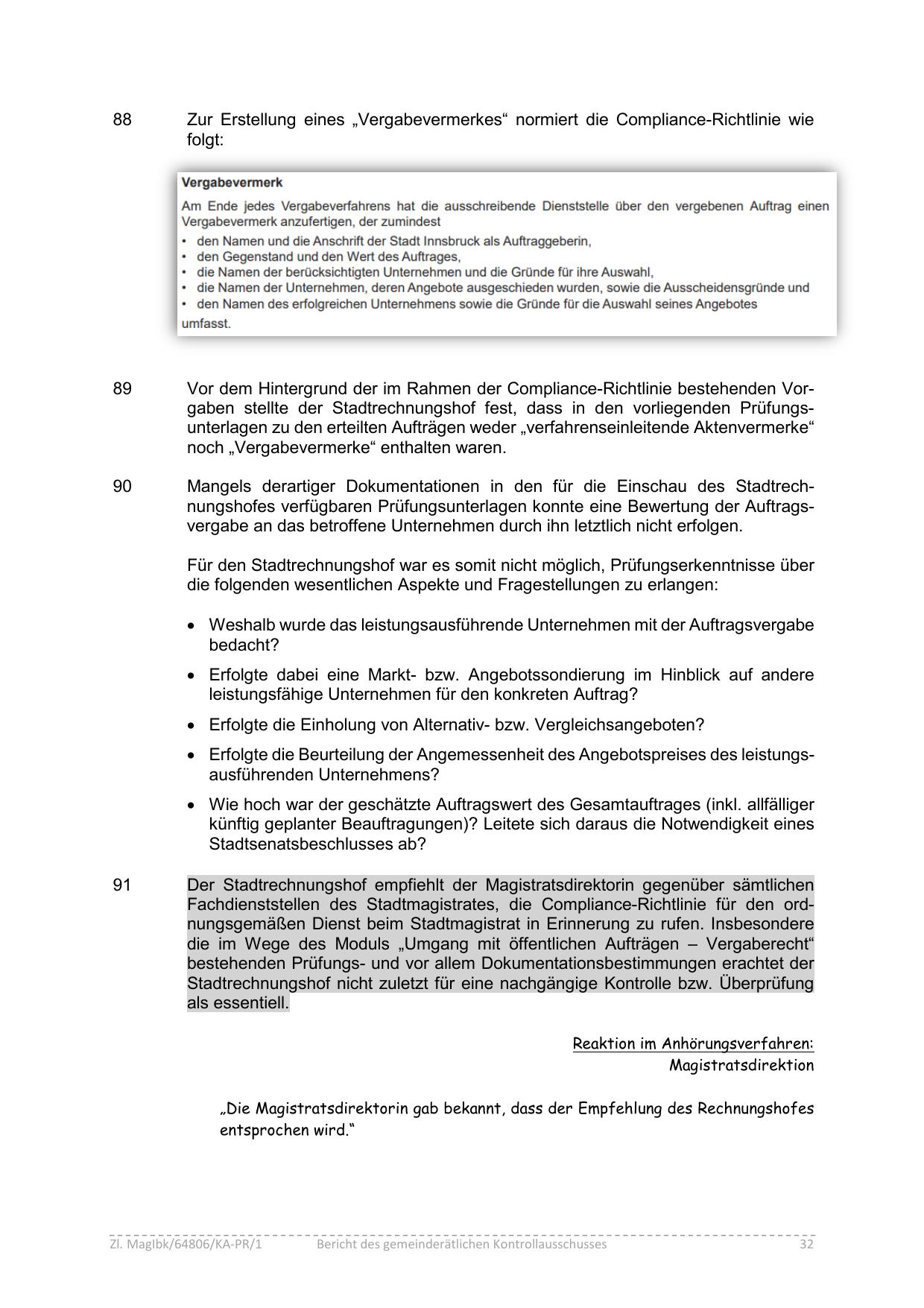Mangels derartiger Dokumentationen in den für die Einschau des Stadtrechnungshofes verfügbaren Prüfungsunterlagen konnte eine Bewertung der Auftragsvergabe an das betroffene Unternehmen durch ihn letztlich nicht erfolgen.