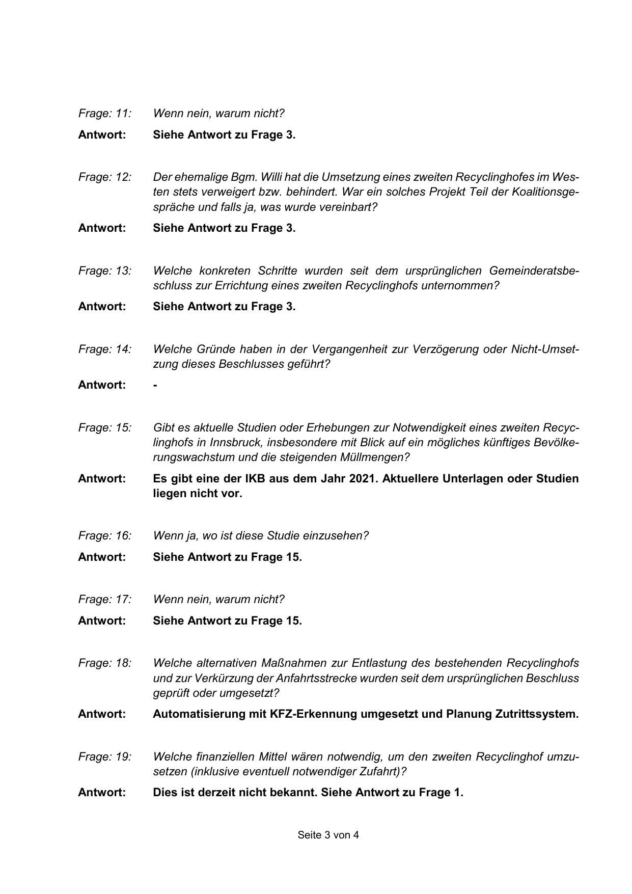 Der ehemalige Bgm. Willi hat die Umsetzung eines zweiten Recyclinghofes im Westen stets verweigert bzw. behindert. War ein solches Projekt Teil der Koalitionsgespräche und falls ja, was wurde vereinbart?