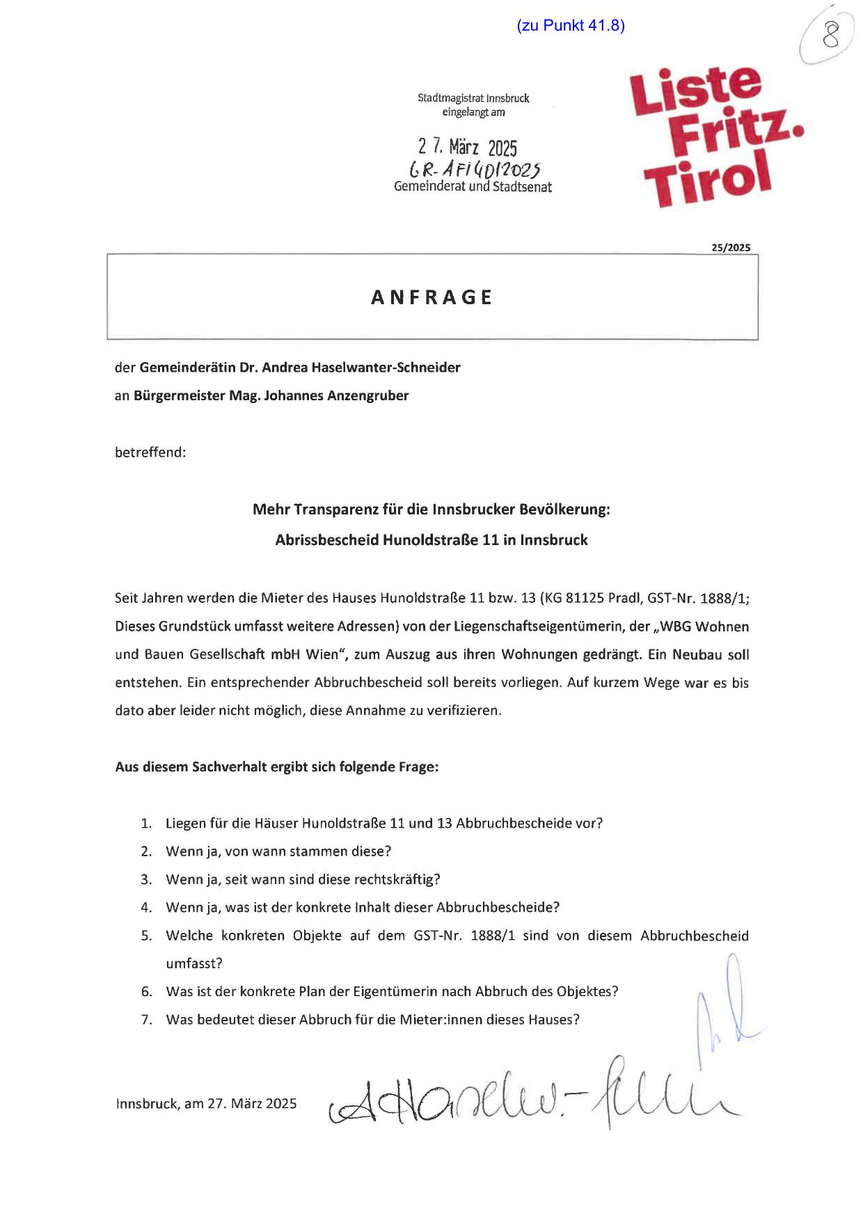 Abrissbescheid Hunoldstraße 11 in Innsbruck