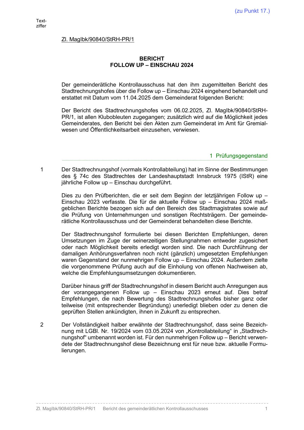 Der Bericht des Stadtrechnungshofes vom 06.02.2025, Zl. MagIbk/90840/StRHPR/1, ist allen Klubobleuten zugegangen; zusätzlich wird auf die Möglichkeit jedes