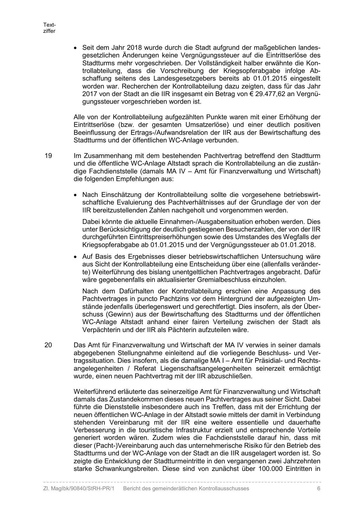 und die öffentliche WC-Anlage Altstadt sprach die Kontrollabteilung an die zuständige Fachdienststelle (damals MA IV – Amt für Finanzverwaltung und Wirtschaft)