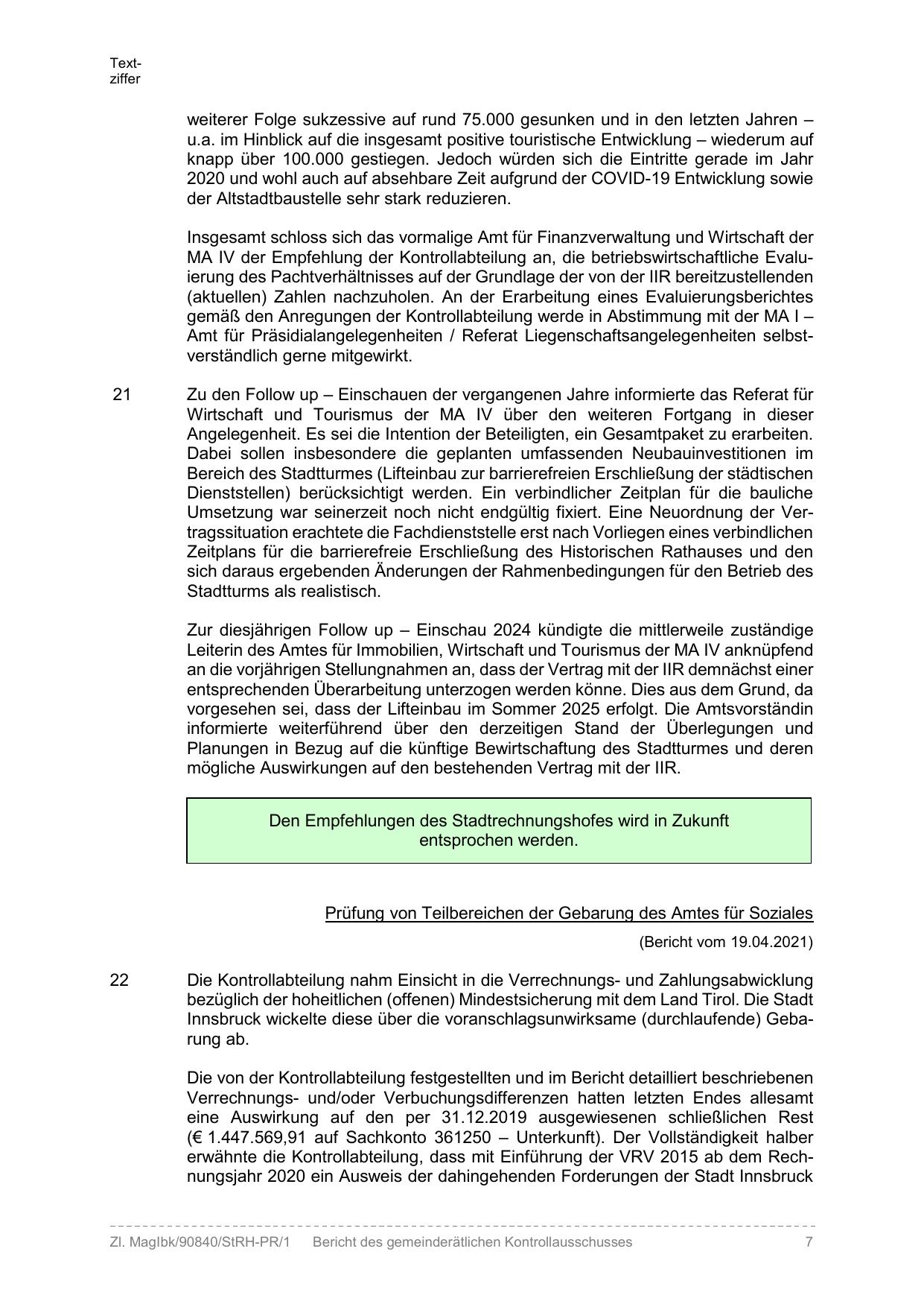 erwähnte die Kontrollabteilung, dass mit Einführung der VRV 2015 ab dem Rechnungsjahr 2020 ein Ausweis der dahingehenden Forderungen der Stadt Innsbruck