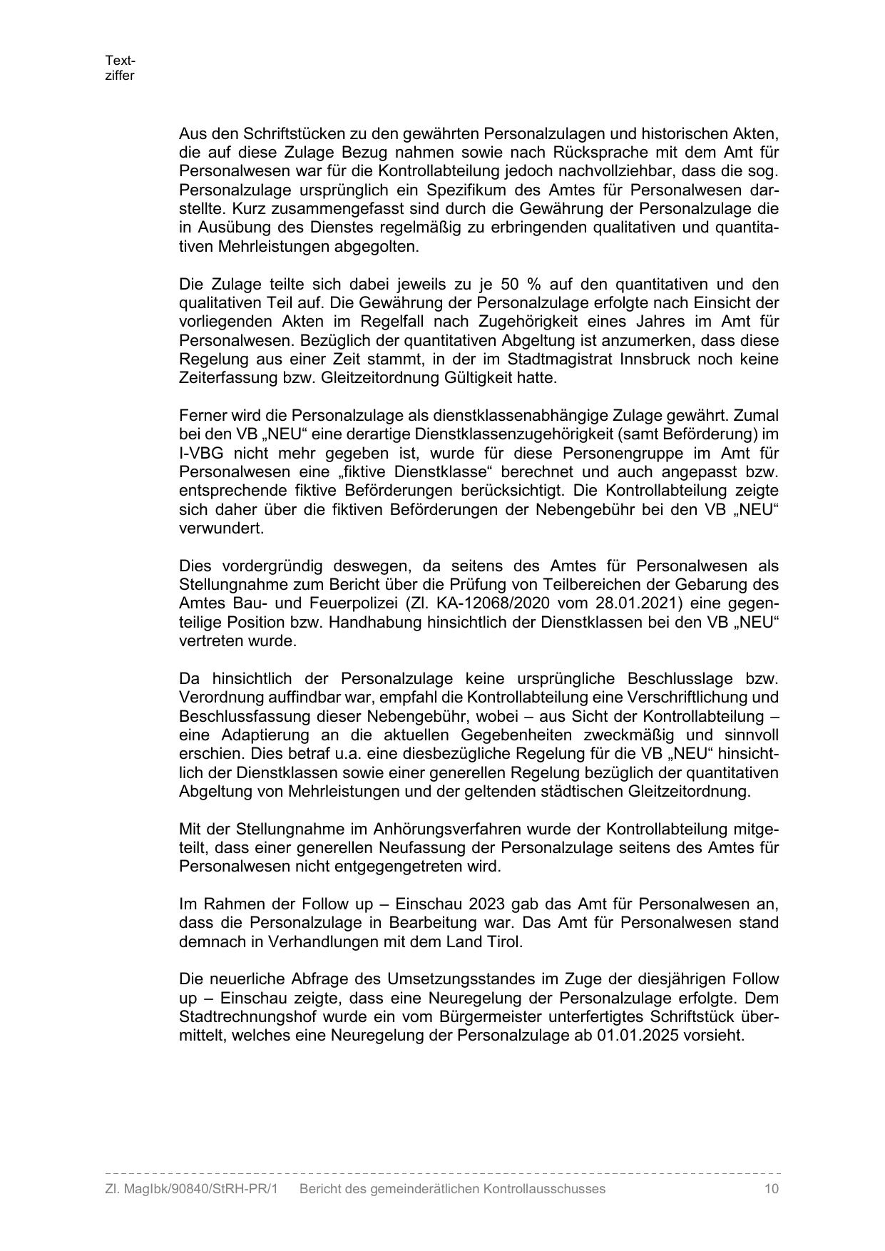 Stadtrechnungshof wurde ein vom Bürgermeister unterfertigtes Schriftstück übermittelt, welches eine Neuregelung der Personalzulage ab 01.01.2025 vorsieht.