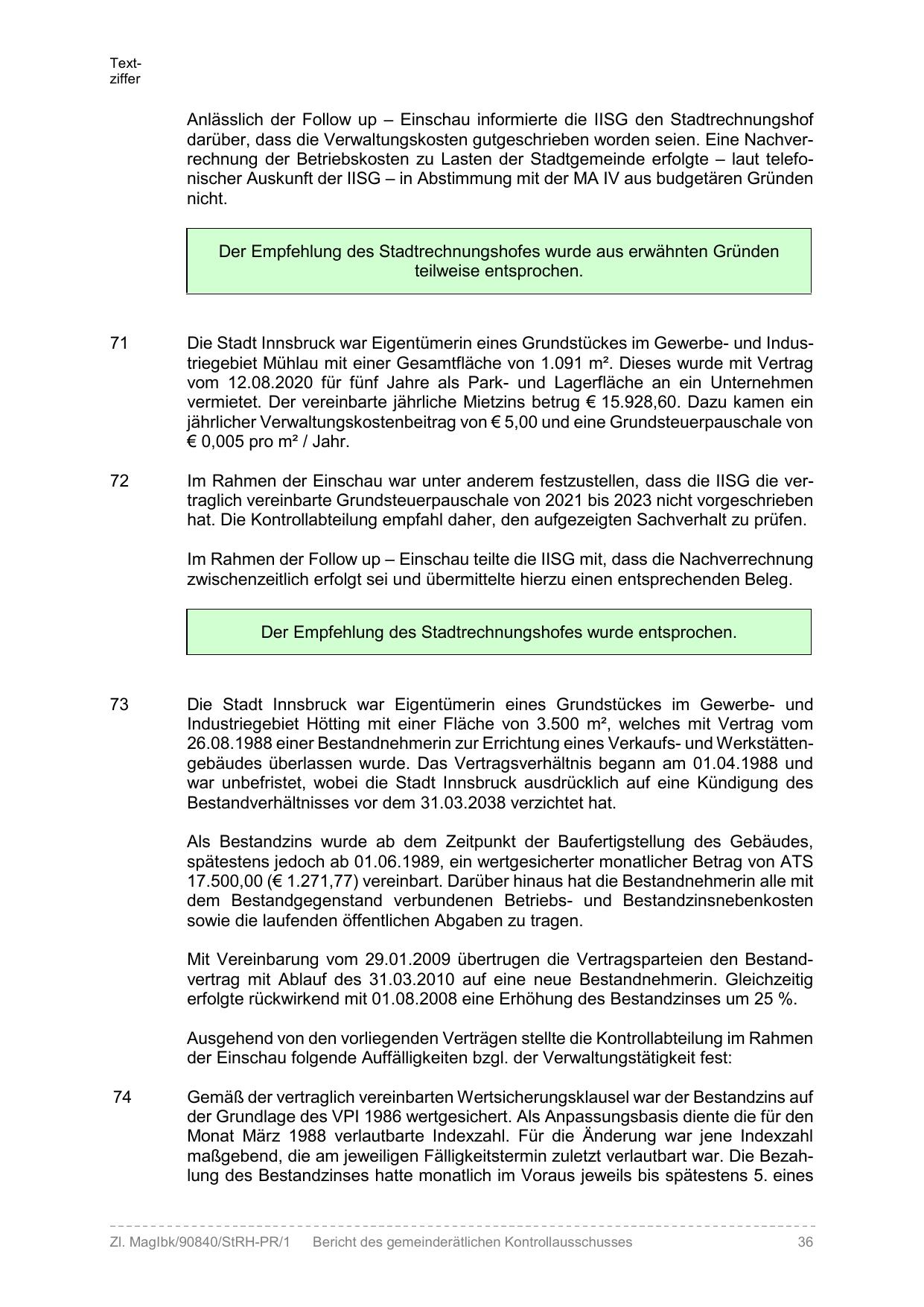 Im Rahmen der Einschau war unter anderem festzustellen, dass die IISG die vertraglich vereinbarte Grundsteuerpauschale von 2021 bis 2023 nicht vorgeschrieben
