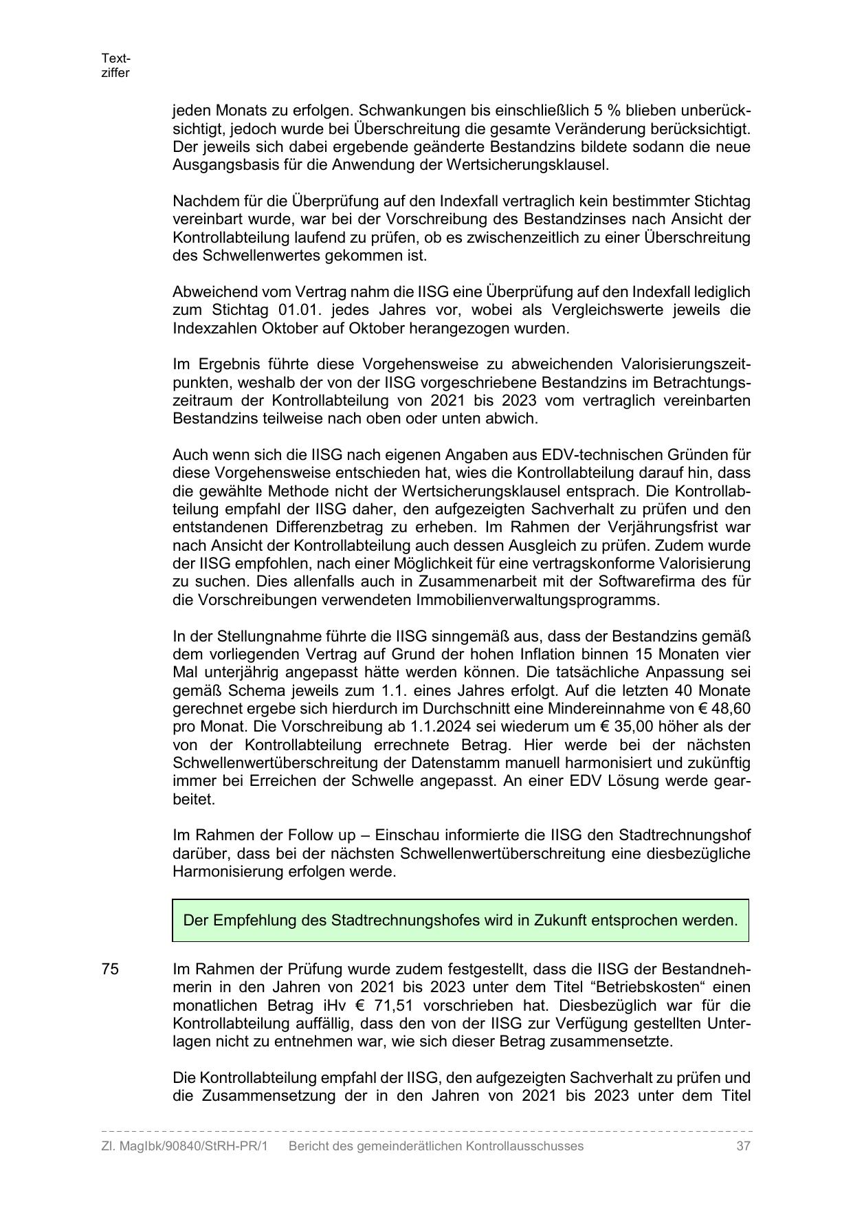 Im Ergebnis führte diese Vorgehensweise zu abweichenden Valorisierungszeitpunkten, weshalb der von der IISG vorgeschriebene Bestandzins im Betrachtungszeitraum der Kontrollabteilung von 2021 bis 2023 vom vertraglich vereinbarten